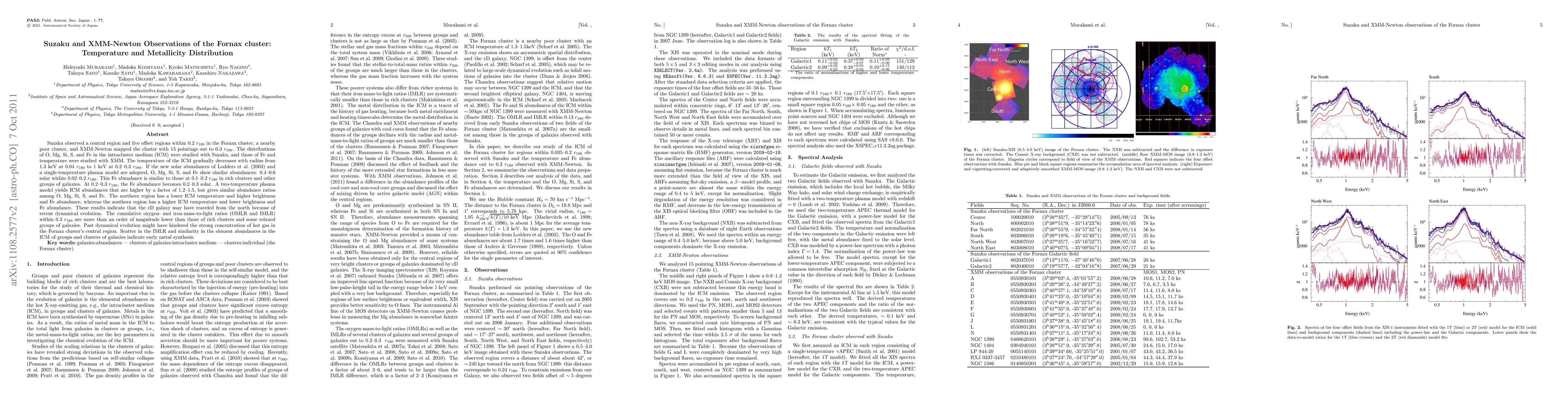 The study used Suzaku and XMM-Newton observations to analyze the temperature and metal distribution in the Fornax galaxy cluster, revealing a gradual temperature decrease and relatively uniform element abundances. Findings suggest the cluster has experienced recent dynamical activity, affecting gas concentration and metal enrichment compared to richer clusters.