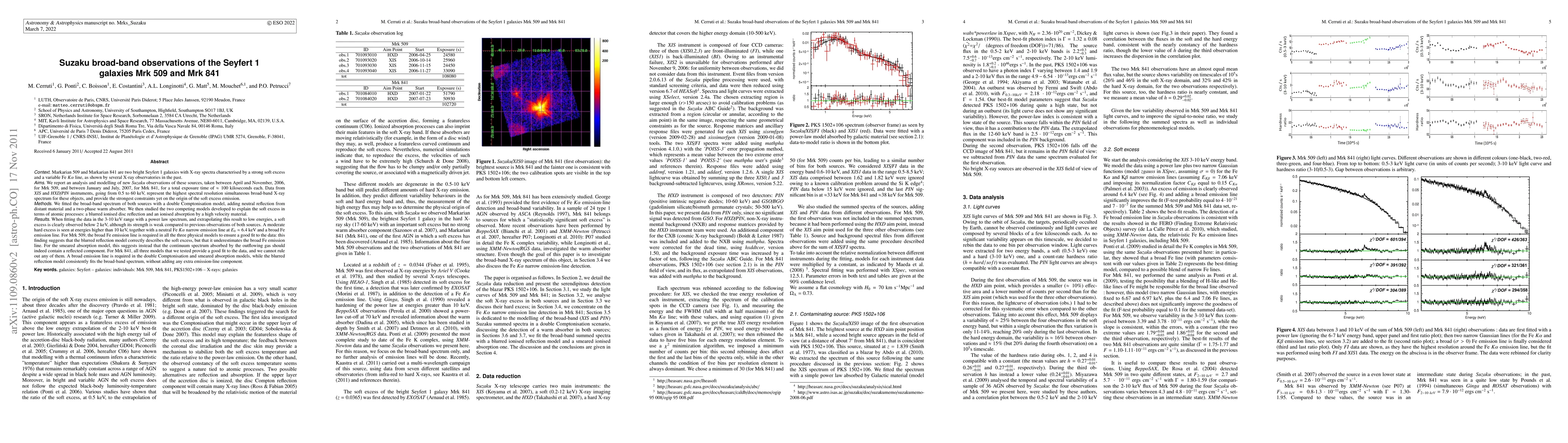 We report an analysis and modelling of new Suzaku observations of the Seyfert 1 galaxies Mrk509 and Mrk841, taken between April and November 2006,for Mrk509,and between January and July 2007,for Mrk841,for a total exposure time of ~100 ks each.Data from XIS and HXD/PIN instruments,going from 0.5 to 60 keV,represent the highest spectral resolution simultaneous broad-band X-ray spectrum for these objects.We fitted the broad-band spectrum of both sources with a double Comptonisation model,adding neutral reflection from distant material and a two-phase warm absorber.We then studied the two competing models developed to explain the soft excess in terms of atomic processes:a blurred ionised disc reflection and an ionised absorption by a high velocity material.When fitting the data in the 3-10 keV range with a power law spectrum,and extrapolating this result to low energies,a soft excess is clearly observed below 2 keV:its strength is however weak compared to previous observations of both sources.A moderate hard excess is seen at energies greater than 10 keV,together with a neutral Fe K_a narrow emission line at E~6.4 keV and a broad Fe emission line.For Mrk509,the broad Fe emission line is required in all the three physical models in order to have a good fit to the data:this finding suggests that the blurred reflection model correctly describes the soft excess,but that it underestimates the broad Fe emission line.For the smeared absorption model,this suggests instead that the continuum spectrum absorbed by the outflowing gas should contain indeed a reflected component.For Mrk841,all three models that we tested provide a good fit to the data,and we cannot invalidate any of them.A broad emission line is required in the double Comptonisation and smeared absorption models,while the blurred reflection model consistently fits the broad-band spectrum,without adding any extra emission-line component.
