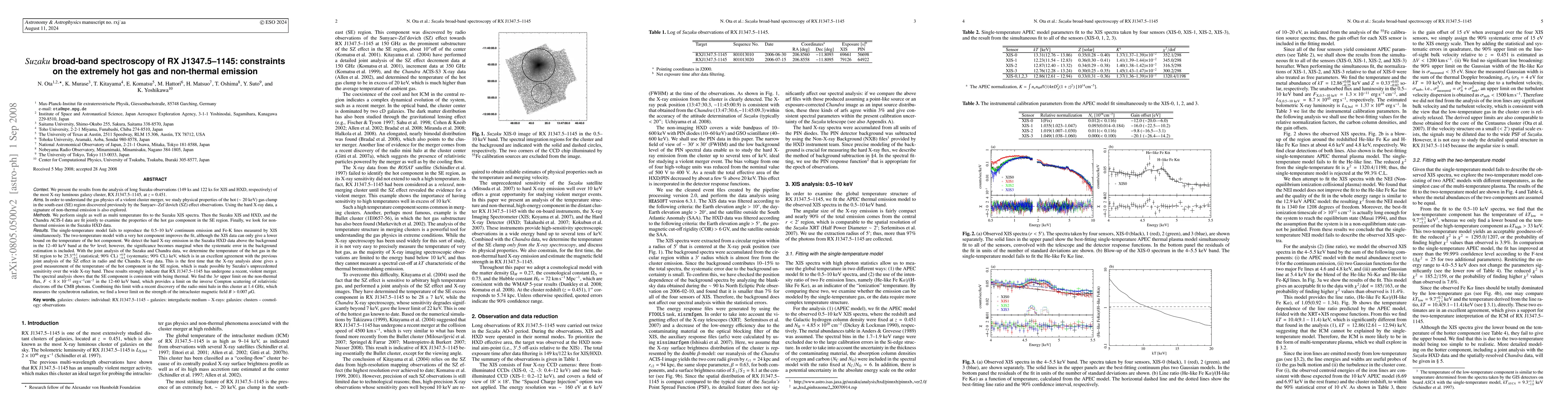 We present the results from the analysis of long Suzaku observations of the most X-ray luminous galaxy cluster RX J1347.5-1145 at z=0.451. Aims: We study physical properties of the hot (~20 keV) gas clump in the south-east (SE) region discovered by the Sunyaev-Zel'dovich (SZ) effect observations, to understand the gas physics of a violent cluster merger. We also explore a signature of non-thermal emission using the hard X-ray data. Results: We find that the single-temperature model fails to reproduce the continuum emission and Fe-K lines measured by XIS simultaneously. The two-temperature model with a very hot component improves the fit, although the XIS data can only give a lower bound on its temperature. We detect the hard X-ray emission in the 12-40 keV band at the 7 sigma level; however, the significance becomes marginal when the systematic error in the background estimation is included. With the Suzaku + Chandra joint analysis, we determine the temperature of the SE excess component to be 25.3^{+6.1}_{-4.5} ^{+6.9}_{-9.5} keV (90% statistical and systematic errors), which is in an excellent agreement with the previous SZ + X-ray analysis. This is the first time that the X-ray spectroscopy alone gives a good measurement of the temperature of the hot component in the SE region, which is made possible by Suzaku's unprecedented sensitivity to the wide X-ray band. These results strongly indicate that the cluster has undergone a recent, violent merger. The spectral analysis shows that the SE component is consistent with being thermal. We find the 3 sigma upper limit on the non-thermal flux, F < 8e-12 erg s^{-1} cm^{-2} in the 12-60 keV band. Combining this limit with a recent discovery of the radio mini halo at 1.4 GHz, we find a lower limit on the strength of the intracluster magnetic field, B > 0.007 micro G.