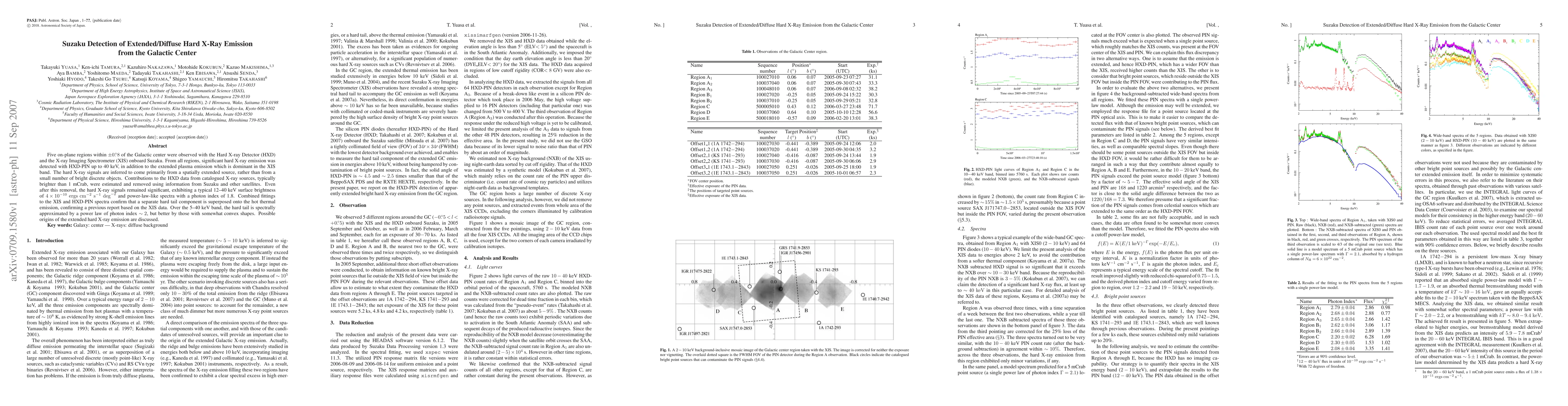 The Suzaku satellite detected significant extended hard X-ray emission from the Galactic Center up to 40 keV, primarily from a spatially extended source rather than discrete objects. The hard X-ray signals, with a surface brightness of 4E-10 erg cm-2 s-1 deg-2, exhibit power-law-like spectra and a hard tail component superimposed on thermal emission.