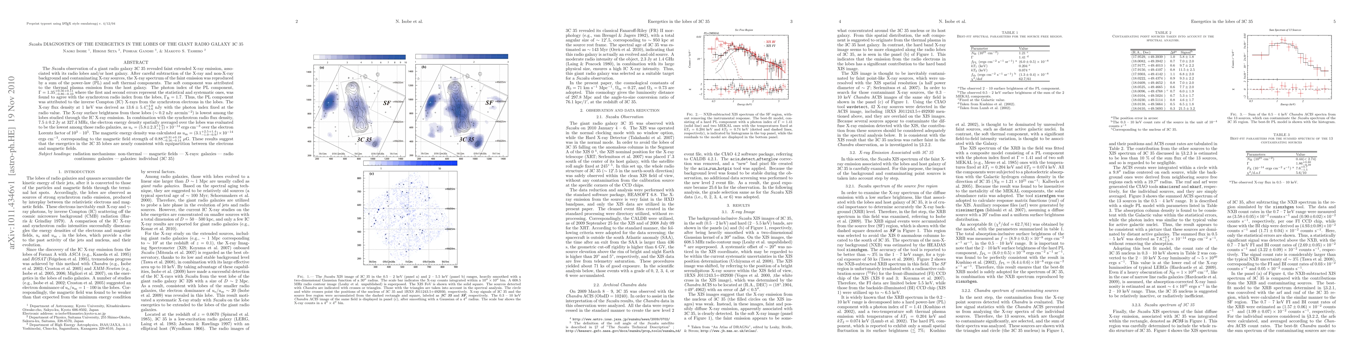 The Suzaku observation of the giant radio galaxy 3C 35 identified faint X-ray emission in its lobes, attributed to inverse Compton scattering by synchrotron electrons. The electron energy density in the lobes is the lowest among similar galaxies, suggesting near equipartition between electrons and magnetic fields.