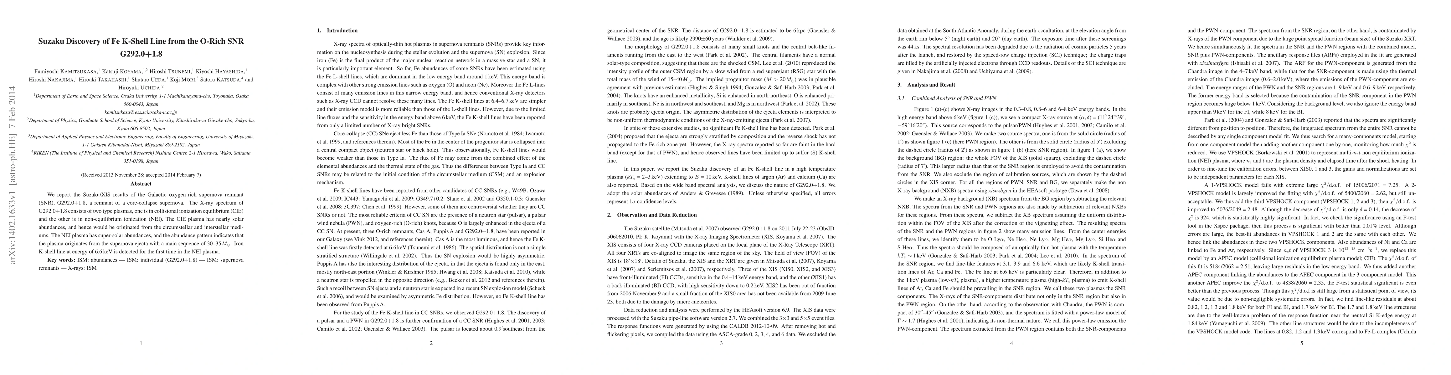 We report the Suzaku/XIS results of the Galactic oxygen-rich supernova remnant (SNR), G292.0+1.8, a remnant of a core-collapse supernova. The X-ray spectrum of G292.0+1.8 consists of two type plasmas, one is in collisional ionization equilibrium (CIE) and the other is in non-equilibrium ionization (NEI). The CIE plasma has nearly solar abundances, and hence would be originated from the circumstellar and interstellar mediums. The NEI plasma has super-solar abundances, and the abundance pattern indicates that the plasma originates from the supernova ejecta with a main sequence of 30-35 Msolar. Iron K-shell line at energy of 6.6 keV is detected for the first time in the NEI plasma.