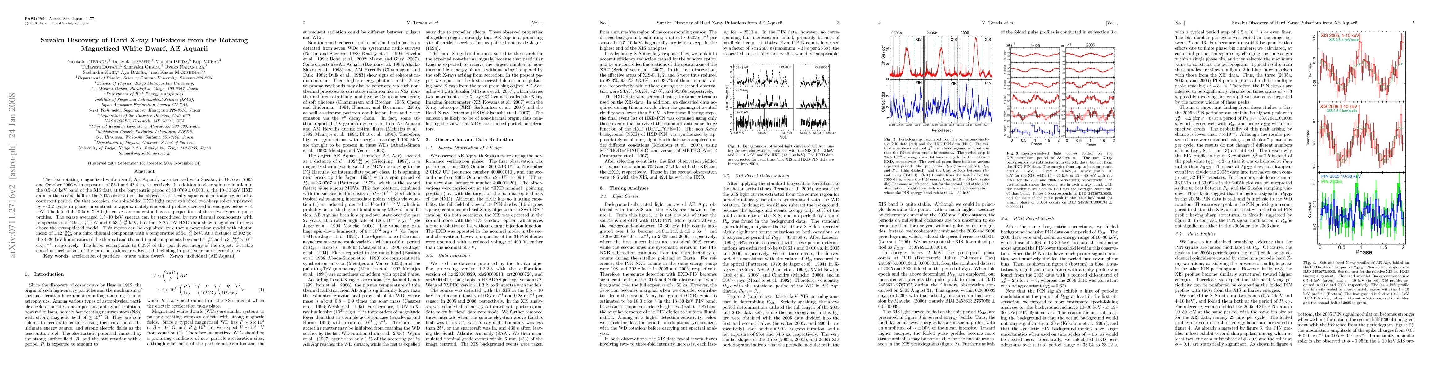 The fast rotating magnetized white dwarf, AE Aquarii, was observed with Suzaku, in October 2005 and October 2006 with exposures of 53.1 and 42.4 ks, respectively. In addition to clear spin modulation in the 0.5--10 keV band of the XIS data at the barycentric period of 33.0769 \pm 0.0001 s, the 10--30 keV HXD data in the second half of the 2005 observation also showed statistically significant periodic signals at a consistent period. On that occasion, the spin-folded HXD light curve exhibited two sharp spikes separated by about 0.2 cycles in phase, in contrast to approximately sinusoidal profiles observed in energies below about 4 keV. The folded 4--10 keV XIS light curves are understood as a superposition of those two types of pulse profiles. The phase averaged 1.5--10 keV spectra can be reproduced by two thermal components with temperatures of $2.90_{-0.16}^{+0.20}$ keV and $0.53_{-0.13}^{+0.14}$ keV, but the 12-25 keV HXD data show a significant excess above the extrapolated model. This excess can be explained by either a power-law model with photon index of $1.12_{-0.62}^{+0.63}$ or a third thermal component with a temperature of $54_{-47}^{+26}$ keV. At a distance of 102 pc, the 4--30 keV luminosities of the thermal and the additional components become $1.7_{-0.6}^{+1.3}$ and $5.3_{-0.3}^{+15.3} \times 10^{29}$ erg s$^{-1}$, respectively. The latter corresponds to 0.09% of the spin down energy of the object. Possible emission mechanisms of the hard pulsations are discussed, including in particular non-thermal ones.