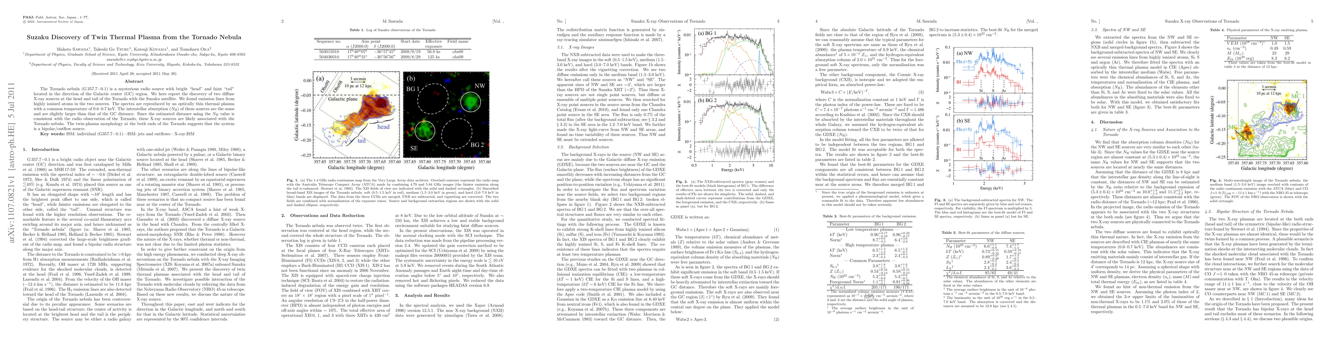 The Tornado nebula (G357.7-0.1) is a mysterious radio source with bright "head" and faint "tail" located in the direction of the Galactic center (GC) region. We here report the discovery of two diffuse X-ray sources at the head and tail of the Tornado with the Suzaku satellite. We found emission lines from highly ionized atoms in the two sources. The spectra are reproduced by an optically thin thermal plasma with a common temperature of 0.6-0.7 keV. The interstellar absorption (NH) of these sources are the same and are slightly larger than that of the GC distance. Since the estimated distance using the NH value is consistent with the radio observation of the Tornado, these X-ray sources are likely associated with the Tornado nebula. The twin-plasma morphology at the both ends of the Tornado suggests that the system is a bipolar/outflow source.