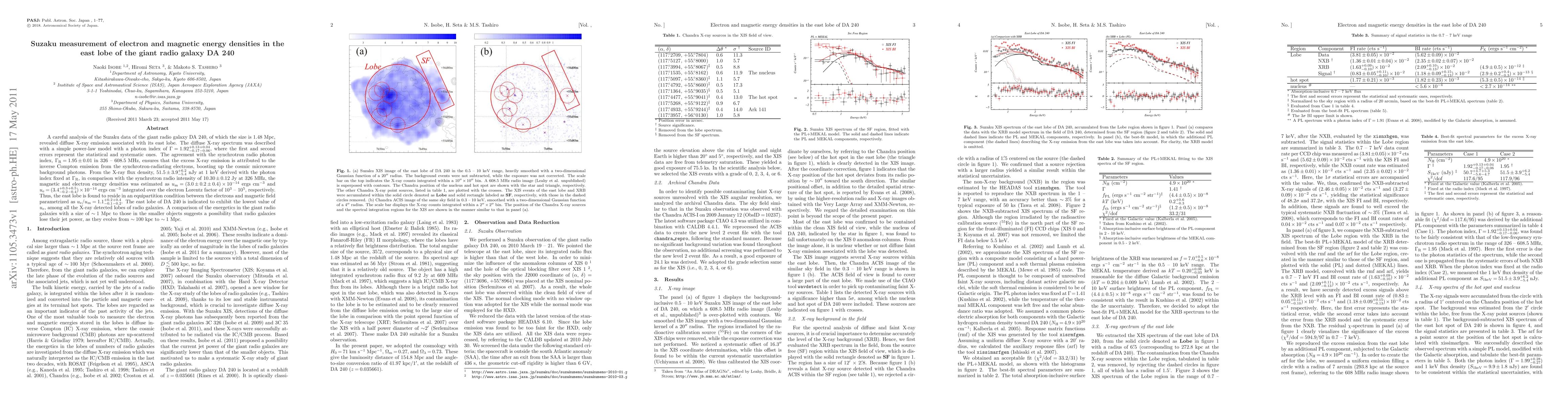 A careful analysis of the Suzaku data of the giant radio galaxy DA 240, of which the size is 1.48 Mpc, revealed diffuse X-ray emission associated with its east lobe. The diffuse X-ray spectrum was described with a simple power-law model with a photon index of 1.92 (-0.17+0.13) (-0.06+0.04), where the first and second errors represent the statistical and systematic ones. The agreement with the synchrotron radio photon index, 1.95 +- 0.01 in 326 -- 608.5 MHz, ensures that the excess X-ray emission is attributed to the inverse Compton emission from the synchrotron-radiating electrons, boosting up the cosmic microwave background photons. From the X-ray flux density, 51.5 +-3.9 (-5.4+6.2) nJy at 1 keV derived with the photon index fixed at the radio index, in comparison with the synchrotron radio intensity of 10.30 +- 0.12 Jy at 326 MHz, the magnetic and electron energy densities was estimated as u_m = (3.0 +-0.2 +-0.4) \times 10^(-14) ergs/cm3 and u_e = (3.4 (-0.2+0.3) (-0.4+0.5)) \times 10^(-14) ergs/cm3 integrated over the electron Lorentz factor of 10^3 -- 10^5, respectively. Thus, the east lobe is found to reside in an equipartition condition between the electrons and magnetic field parametrized as u_e/u_m = 1.1 (-0.1+0.2) (-0.2+0.4). The east lobe of DA 240 is indicated to exhibit the lowest value of u_e, among all the X-ray detected lobes of radio galaxies. A comparison of the energetics in the giant radio galaxies with a size of about 1 Mpc to those in the smaller objects suggests a possibility that radio galaxies lose their jet power, as they evolve from 100 kpc to 1 Mpc.