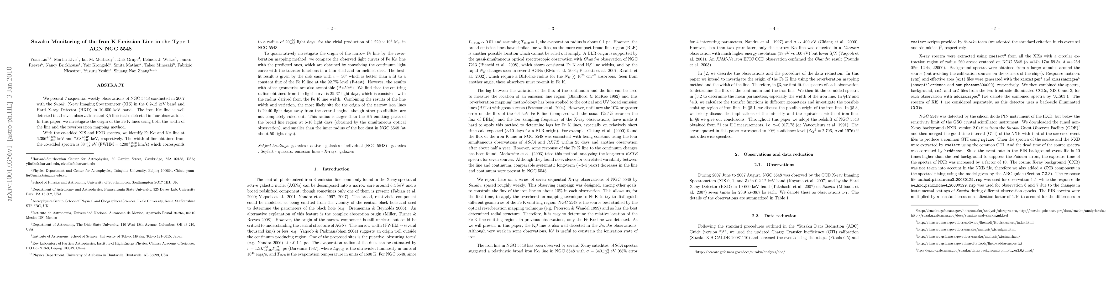 We present 7 sequential weekly observations of NGC 5548 conducted in 2007 with the \textit{Suzaku} X-ray Imaging Spectrometer (XIS) in the 0.2-12 keV band and Hard X-ray Detector (HXD) in 10-600 keV band. The iron K$\alpha$ line is well detected in all seven observations and K$\beta$ line is also detected in four observations. In this paper, we investigate the origin of the Fe K lines using both the width of the line and the reverberation mapping method. With the co-added XIS and HXD spectra, we identify Fe K$\alpha$ and K$\beta$ line at 6.396$_{-0.007}^{+0.009}$ keV and 7.08$_{-0.05}^{+0.05}$ keV, respectively. The width of line obtained from the co-added spectra is 38$_{-18}^{+16}$ eV ($\textrm{FWHM}=4200_{-2000}^{+1800}$ km/s) which corresponds to a radius of 20$_{-10}^{+50}$ light days, for the virial production of $1.220\times10^7$ M$_{\odot}$ in NCG 5548. To quantitatively investigate the origin of the narrow Fe line by the reverberation mapping method, we compare the observed light curves of Fe K$\alpha$ line with the predicted ones, which are obtained by convolving the continuum light curve with the transfer functions in a thin shell and an inclined disk. The best-fit result is given by the disk case with $i=30^\circ$ which is better than a fit to a constant flux of the Fe K line at the 92.7% level (F-test). We find that the emitting radius obtained from the light curve is 25-37 light days, which is consistent with the radius derived from the Fe K line width. Combining the results of the line width and variation, the most likely site for the origin of the narrow iron lines is 20-40 light days away from the central engine, though other possibilities are not completely ruled out. (abridged)