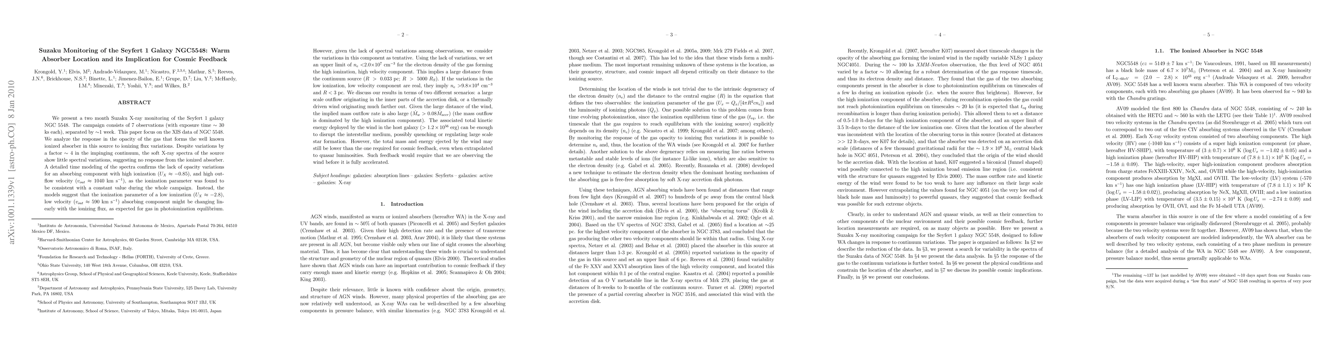 (Abridged) We present a two month Suzaku X-ray monitoring of the Seyfert 1 galaxy NGC 5548. The campaign consists of 7 observations. We analyze the response in the opacity of the gas that forms the ionized absorber to ionizing flux variations. Despite variations by a factor of 4 in the impinging continuum, the soft X-ray spectra of the source show little spectral variations, suggesting no response from the ionized absorber. A detailed time modeling confirms the lack of opacity variations for an absorbing component with high ionization. Instead, the models tentatively suggest that the ionization parameter of a low ionization absorbing component might be changing with the ionizing flux, as expected for gas in photoionization equilibrium. Using the lack of variations, we set an upper limit of n_e <2.0E7 cm-3 for the electron density of the gas forming the high ionization, high velocity component. This implies a large distance from the continuum source (R > 0.033 pc). If the variations in the low ionization component are real, they imply n_e >9.8E4 cm-3 and R < 3 pc. We discuss our results in terms of two different scenarios: a large scale outflow originating in the inner parts of the accretion disk, or a thermally driven wind originating much farther out. Given the large distance of the wind, the implied mass outflow rate is also large (Mw > 0.08 Maccr). The associated total kinetic energy deployed by the wind in the host galaxy (>1.2E56 erg) can be enough to disrupt the interstellar medium, possibly regulating large scale star formation. The total mass and energy ejected by the wind is still lower than the one required for cosmic feedback, even when extrapolated to quasar luminosities. Such feedback would require that we are observing the wind before it is fully accelerated.