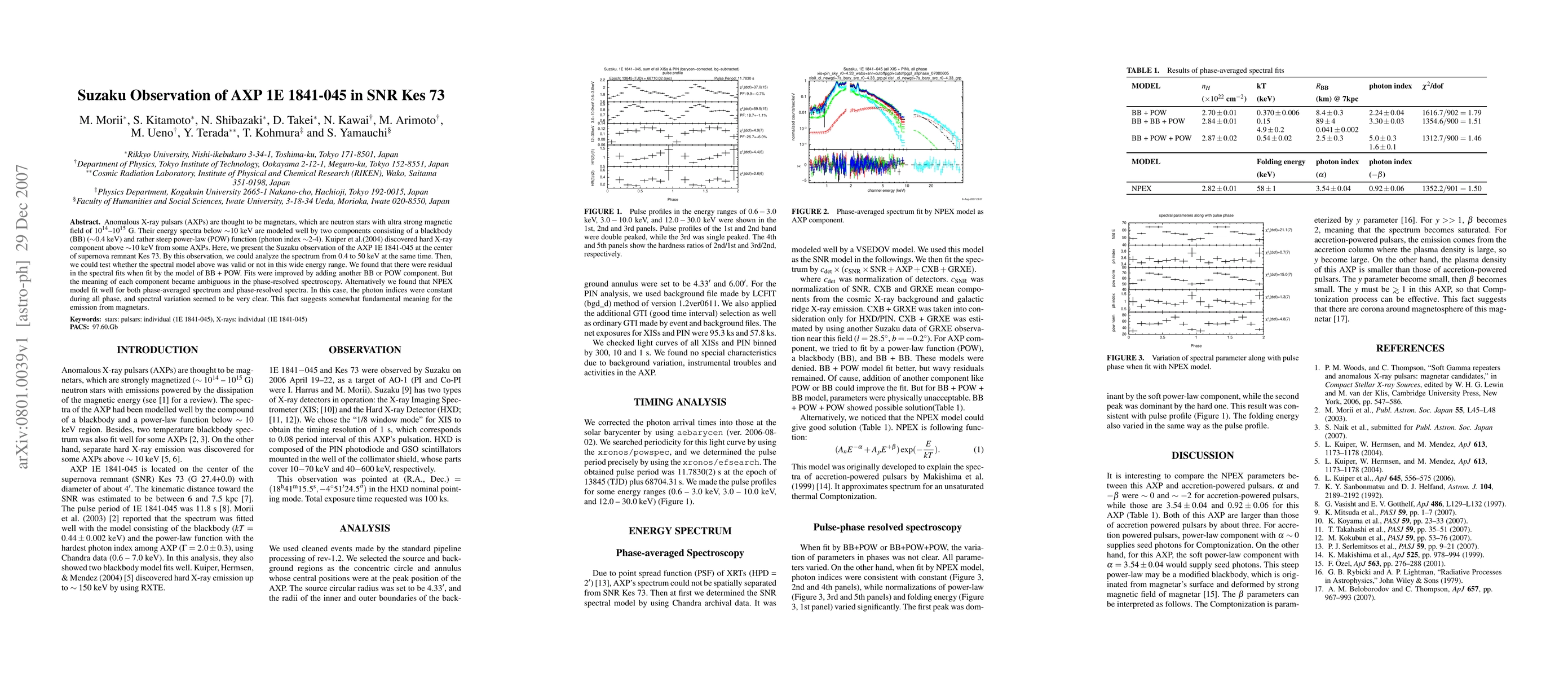 The Suzaku observation of AXP 1E 1841-045 in SNR Kes 73 revealed that the standard BB+POW model didn't fit the spectrum well. Adding another BB or POW component improved fits but lacked clarity. However, the NPEX model successfully fit both phase-averaged and phase-resolved spectra, showing constant photon indices and clear spectral variation, suggesting fundamental insights into magnetar emission.