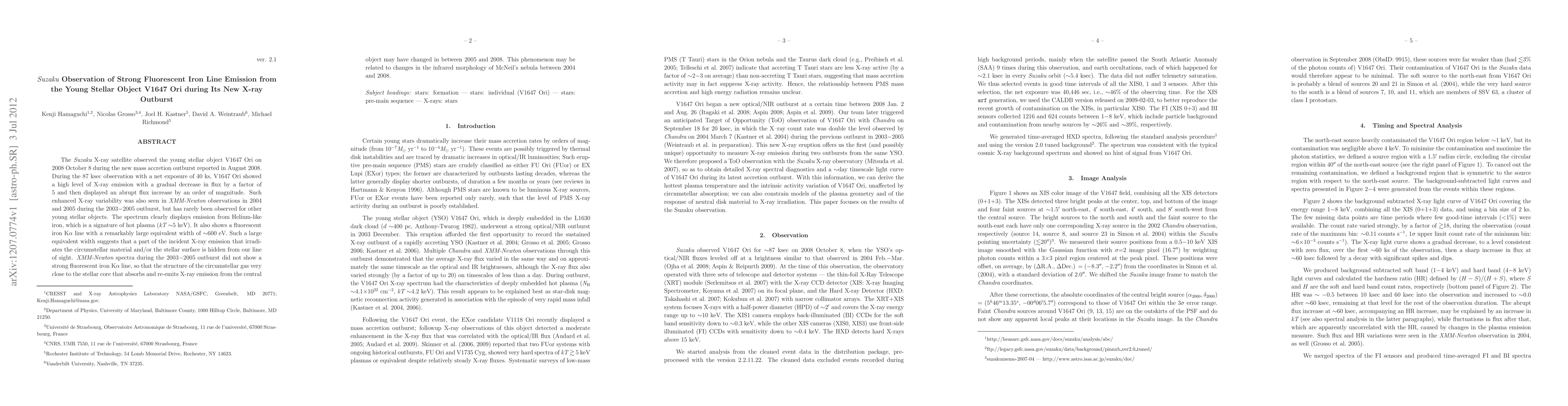 The Suzaku X-ray satellite observed the young stellar object V1647 Ori on 2008 October 8 during the new mass accretion outburst reported in August 2008. During the 87 ksec observation with a net exposure of 40 ks, V1647 Ori showed a high level of X-ray emission with a gradual decrease in flux by a factor of 5 and then displayed an abrupt flux increase by an order of magnitude. Such enhanced X-ray variability was also seen in XMM-Newton observations in 2004 and 2005 during the 2003-2005 outburst, but has rarely been observed for other young stellar objects. The spectrum clearly displays emission from Helium-like iron, which is a signature of hot plasma (kT ~5 keV). It also shows a fluorescent iron Kalpha line with a remarkably large equivalent width of ~600 eV. Such a large equivalent width suggests that a part of the incident X-ray emission that irradiates the circumstellar material and/or the stellar surface is hidden from our line of sight. XMM-Newton spectra during the 2003-2005 outburst did not show a strong fluorescent iron Kalpha line, so that the structure of the circumstellar gas very close to the stellar core that absorbs and re-emits X-ray emission from the central object may have changed in between 2005 and 2008. This phenomenon may be related to changes in the infrared morphology of McNeil's nebula between 2004 and 2008.