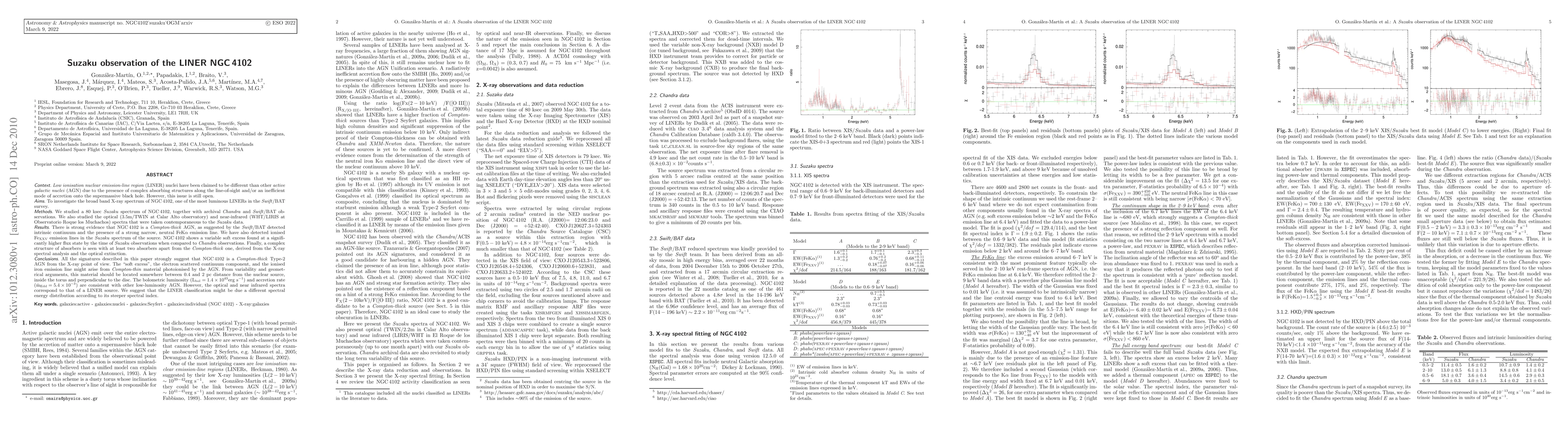 Low ionisation nuclear emission-line region (LINER) nuclei have been claimed to be different than other active galactic nuclei (AGN) due to the presence of complex absorbing structures along the line-of-sight and/or an inefficient mode of accretion onto the supermassive black hole. However, this issue is still open. We have investigated the broad band X-ray spectrum of NGC 4102, one of the most luminous LINERs in the Swift/BAT survey. We studied a 80 ksec Suzaku spectrum of NGC 4102, together with archival Chandra and Swift/BAT observations. We also studied the optical (3.5m/TWIN at Calar Alto observatory) and near-infrared (WHT/LIRIS at Observatorio Roque los Muchachos) spectra that were taken contemporaneous to the Suzaku data. There is strong evidence that NGC 4102 is a Compton-thick AGN, as suggested by the Swift/BAT detected intrinsic continuum and the presence of a strong narrow, neutral FeKa emission line. We have also detected ionised FeXXV emission lines in the Suzaku spectrum of the source. NGC 4102 shows a variable soft excess found at a significantly higher flux state by the time of Suzaku observations when compared to Chandra observations. Finally, a complex structure of absorbers is seen with at least two absorbers apart from the Compton-thick one, derived from the X-ray spectral analysis and the optical extinction.