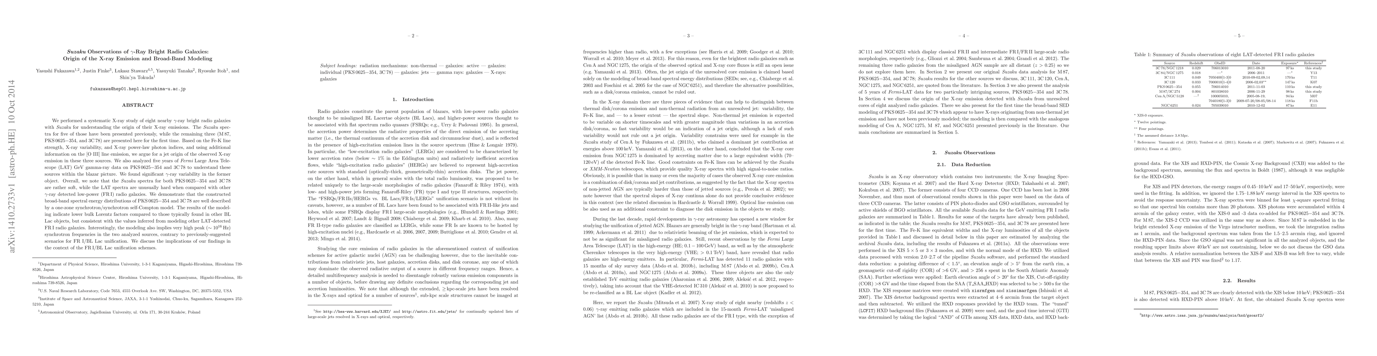 This study uses Suzaku observations to investigate the X-ray emissions of three gamma-ray bright radio galaxies, finding evidence for a jet origin based on spectral characteristics. The research also analyzes Fermi LAT data, revealing significant gamma-ray variability and high synchrotron frequencies, challenging existing FR I/BL Lac unification models.