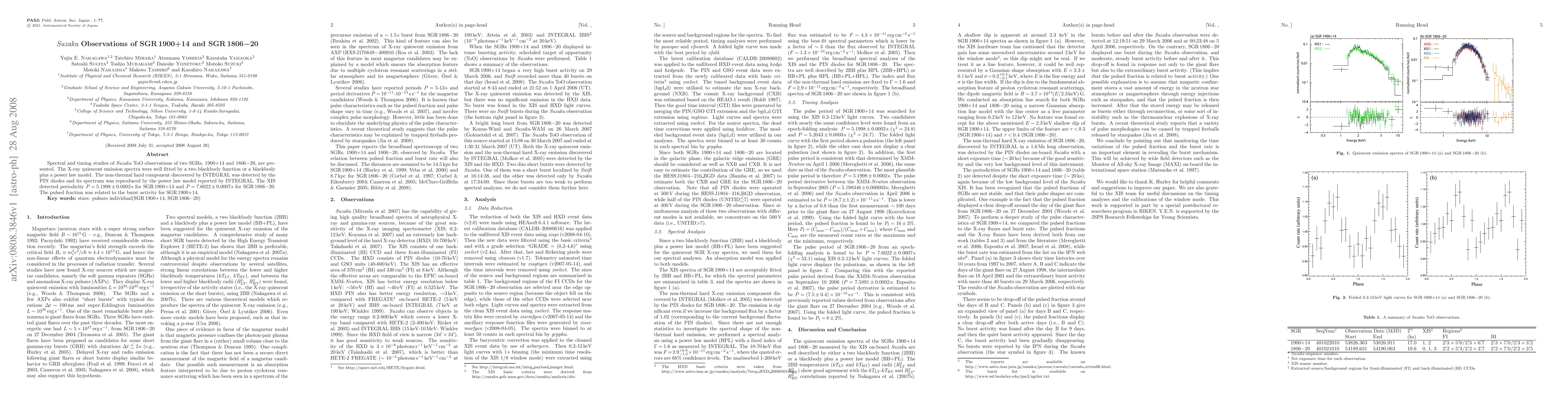 Spectral and timing studies of Suzaku ToO observations of two SGRs, 1900+14 and 1806-20, are presented. The X-ray quiescent emission spectra were well fitted by a two blackbody function or a blackbody plus a power law model. The non-thermal hard component discovered by INTEGRAL was detected by the PIN diodes and its spectrum was reproduced by the power law model reported by INTEGRAL. The XIS detected periodicity P = 5.1998+/-0.0002 s for SGR 1900+14 and P = 7.6022+/-0.0007 s for SGR 1806-20. The pulsed fraction was related to the burst activity for SGR 1900+14.