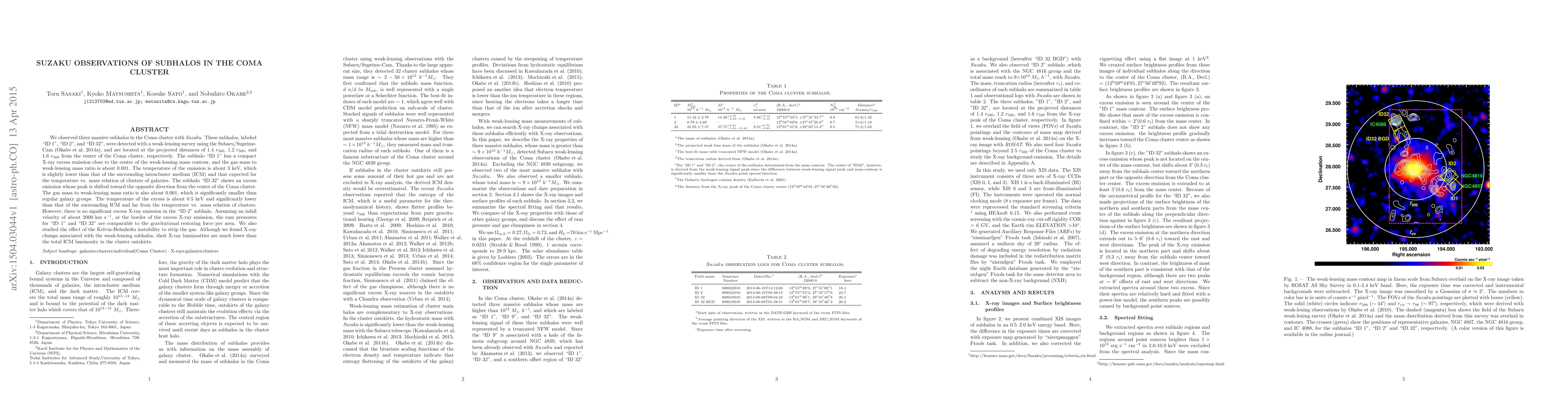 This study uses Suzaku observations to analyze three subhalos in the Coma cluster, revealing distinct X-ray emission characteristics and gas mass ratios. Subhalo "ID 1" shows a compact X-ray excess, while "ID 32" exhibits a significantly lower temperature and gas mass, suggesting gas stripping effects.