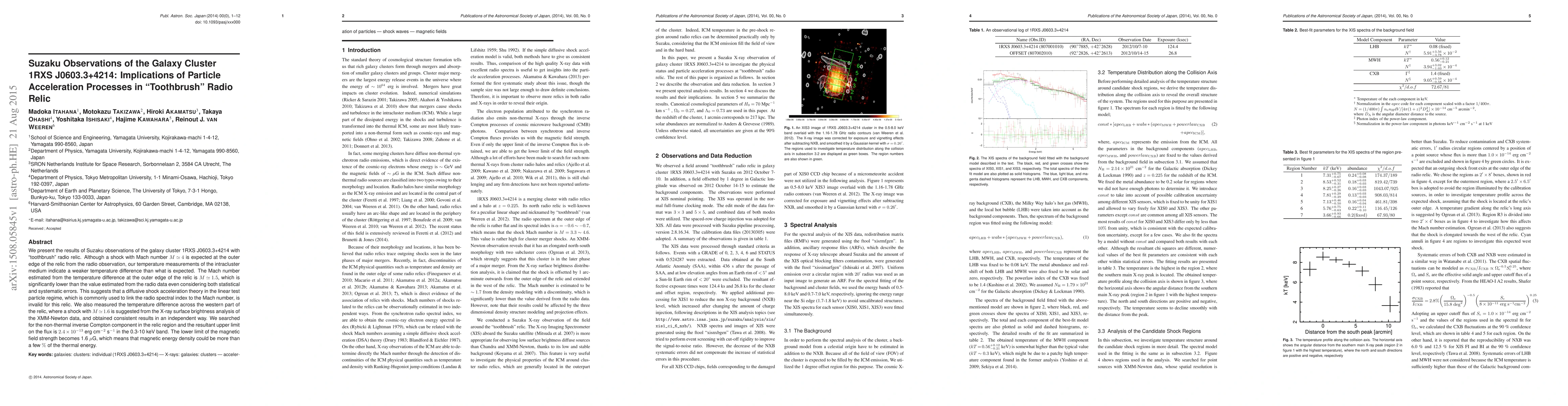 We present the results of Suzaku observations of the galaxy cluster 1RXS J0603.3+4214 with "toothbrush" radio relic. Although a shock with Mach number $M \simeq 4$ is expected at the outer edge of the relic from the radio observation, our temperature measurements of the intracluster medium indicate a weaker temperature difference than what is expected. The Mach number estimated from the temperature difference at the outer edge of the relic is $M \simeq 1.5$, which is significantly lower than the value estimated from the radio data even considering both statistical and systematic errors. This suggests that a diffusive shock acceleration theory in the linear test particle regime, which is commonly used to link the radio spectral index to the Mach number, is invalid for this relic. We also measured the temperature difference across the western part of the relic, where a shock with $M \simeq 1.6$ is suggested from the X-ray surface brightness analysis of the XMM-Newton data, and obtained consistent results in an independent way. We searched for the non-thermal inverse Compton component in the relic region and the resultant upper limit on the flux is $2.4 \times 10^{-13}$ erg cm$^{-2}$ s$^{-1}$ in the 0.3-10 keV band. The lower limit of the magnetic field strength becomes 1.6 $\mu$G, which means that magnetic energy density could be more than a few $\% $ of the thermal energy.