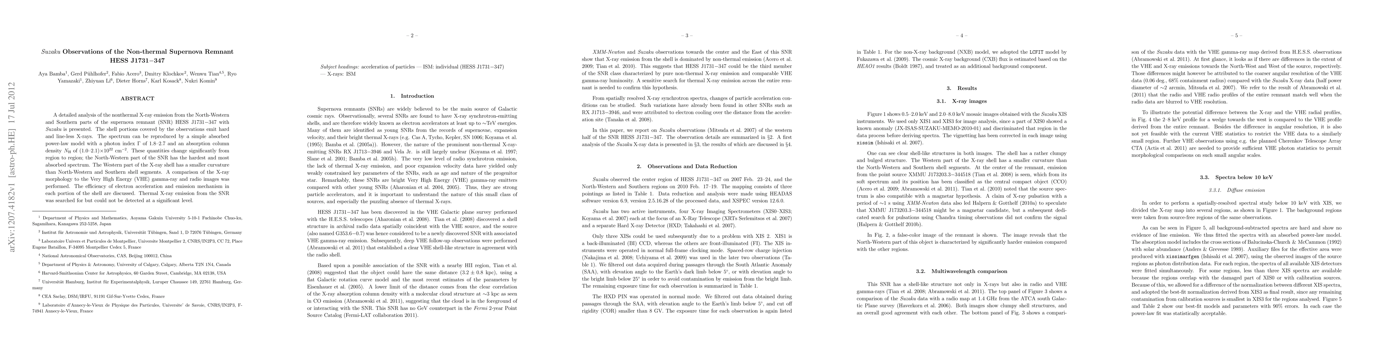 The Suzaku observations of the nonthermal X-ray emission from the supernova remnant HESS J1731-347 reveal hard, line-less spectra best fit by absorbed power-law models, with varying photon indices and absorption column densities across different regions. The study discusses the efficiency of electron acceleration and emission mechanisms in each segment of the shell.