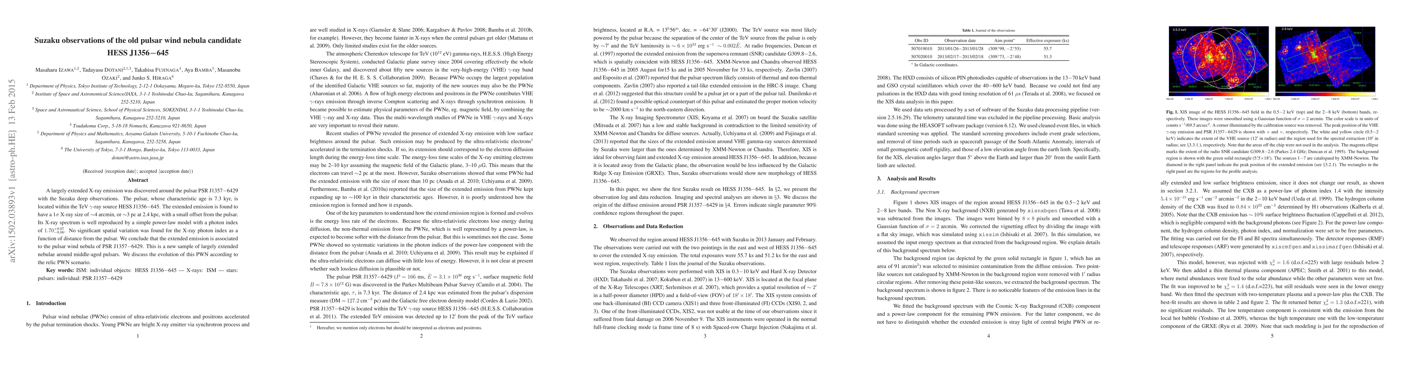 Suzaku observations reveal extended X-ray emission around the pulsar PSR J1357-6429, confirming it as a pulsar wind nebula associated with the TeV gamma-ray source HESS J1356-645. The nebula's X-ray spectrum aligns with a power-law model, indicating it is a new example of extended nebulae around middle-aged pulsars.
