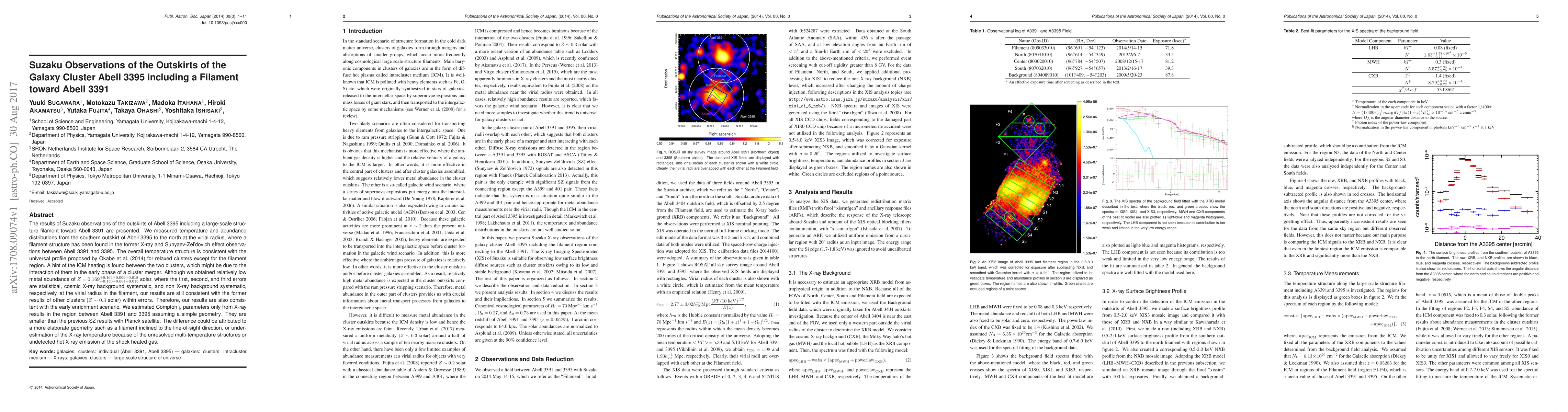 The results of Suzaku observations of the outskirts of Abell 3395 including a large-scale structure filament toward Abell 3391 are presented. We measured temperature and abundance distributions from the southern outskirt of Abell 3395 to the north at the virial radius, where a filament structure has been found in the former X-ray and Sunyaev-Zel'dovich effect observations between Abell 3391 and 3395. The overall temperature structure is consistent with the universal profile proposed by Okabe et al.(2014) for relaxed clusters except for the filament region. A hint of the ICM heating is found between the two clusters, which might be due to the interaction of them in the early phase of a cluster merger. Although we obtained relatively low metal abundance of $Z=0.169^{+0.164+0.009+0.018 }_{-0.150-0.004-0.015 }$ solar, where the first, second, and third errors are statistical, cosmic X-ray background systematic, and non X-ray background systematic, respectively, at the virial radius in the filament, our results are still consistent with the former results of other clusters ($Z \sim 0.3$ solar) within errors. Therefore, our results are also consistent with the early enrichment scenario. We estimated Compton $y$ parameters only from X-ray results in the region between Abell 3391 and 3395 assuming a simple geometry. They are smaller than the previous SZ results with Planck satellite. The difference could be attributed to a more elaborate geometry such as a filament inclined to the line-of-sight direction, or underestimation of the X-ray temperature because of the unresolved multi-temperature structures or undetected hot X-ray emission of the shock heated gas.