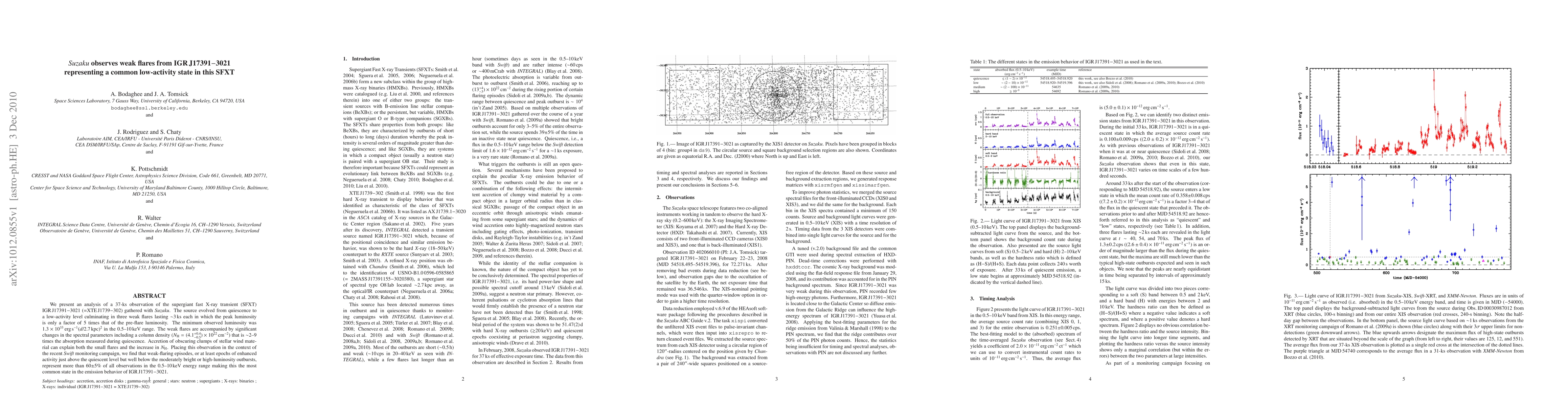 We present an analysis of a 37-ks observation of the supergiant fast X-ray transient (SFXT) IGR J17391-3021 (=XTE J1739-302) gathered with Suzaku. The source evolved from quiescence to a low-activity level culminating in three weak flares lasting ~3 ks each in which the peak luminosity is only a factor of 5 times that of the pre-flare luminosity. The minimum observed luminosity was 1.3x10^33 erg/s (d/2.7 kpc)^2 in the 0.5--10 keV range. The weak flares are accompanied by significant changes in the spectral parameters including a column density (nH = (4.1+-0.5)x10^22 /cm^2) that is ~2--9 times the absorption measured during quiescence. Accretion of obscuring clumps of stellar wind material can explain both the small flares and the increase in nH. Placing this observation in the context of the recent Swift monitoring campaign, we find that weak-flaring episodes, or at least epochs of enhanced activity just above the quiescent level but well below the moderately bright or high-luminosity outbursts, represent more than 60+-5% of all observations in the 0.5--10keV energy range making this the most common state in the emission behavior of IGR J17391-3021