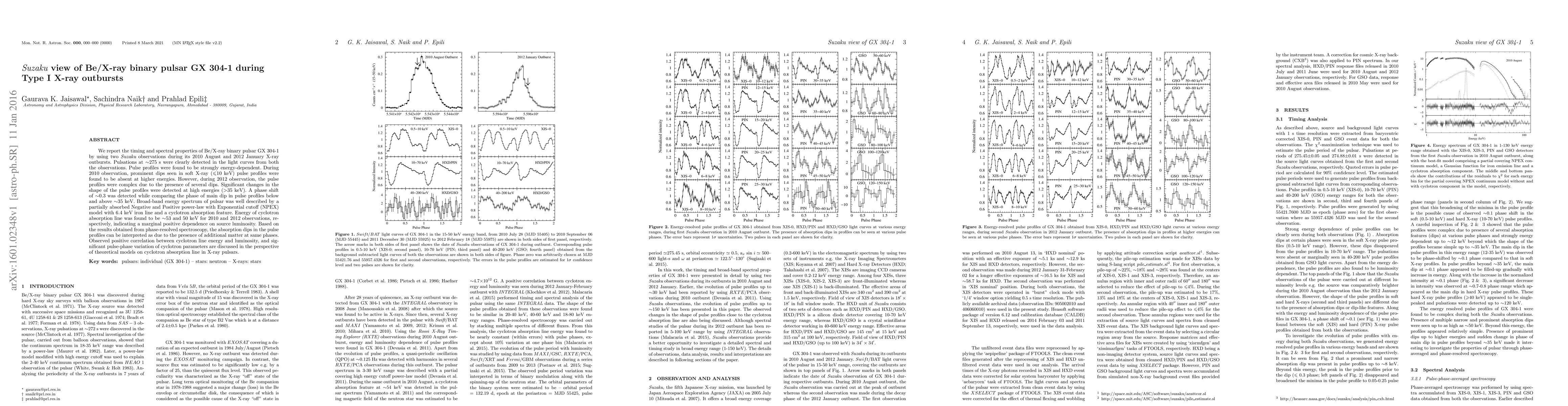 This study analyzes the timing and spectral properties of the Be/X-ray binary pulsar GX 304-1 during two Suzaku observations during its 2010 and 2012 X-ray outbursts, revealing energy-dependent pulse profiles and significant changes in pulse shape at high energies. The cyclotron absorption line energy shows a marginal positive dependence on luminosity, suggesting theoretical implications for the cyclotron absorption line in X-ray pulsars.