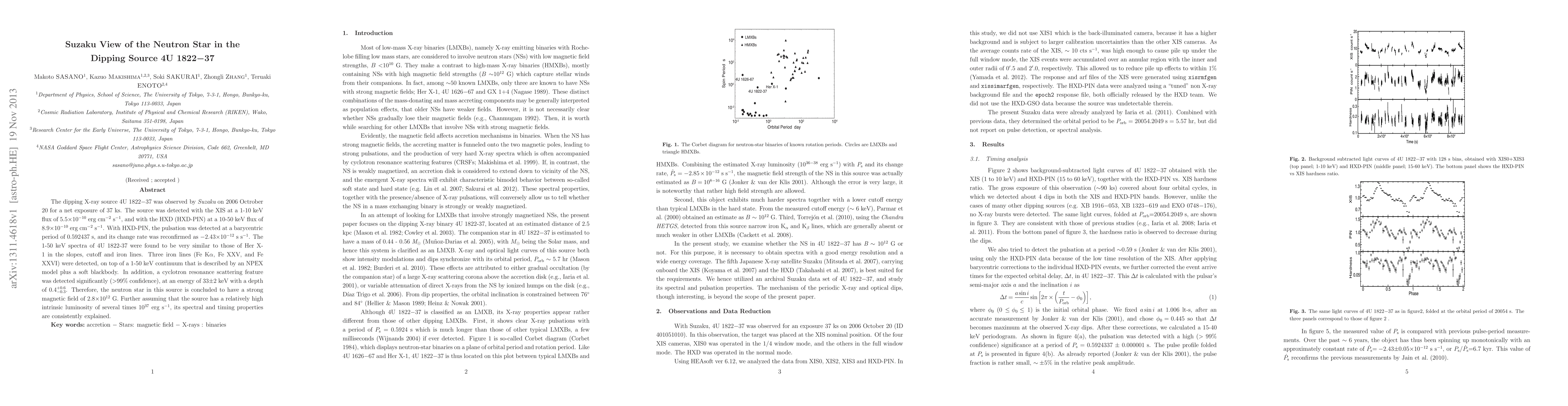 The Suzaku observation of the neutron star in the dipping X-ray source 4U 1822-37 revealed a strong magnetic field of 2.8×10¹² G, detected cyclotron resonance scattering feature at 33±2 keV, and spectral similarities to Her X-1, supporting a high intrinsic luminosity of several times 10³⁷ erg s⁻¹.