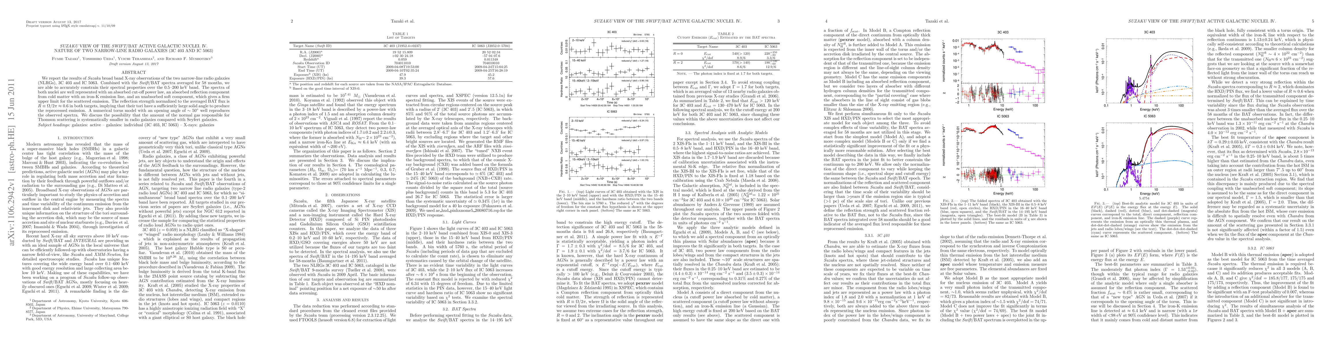We report the results of Suzaku broad band X-ray observations of the two narrow-line radio galaxies (NLRGs), 3C 403 and IC 5063. Combined with the Swift/BAT spectra averaged for 58 months, we are able to accurately constrain their spectral properties over the 0.5--200 keV band. The spectra of both nuclei are well represented with an absorbed cut-off power law, an absorbed reflection component from cold matter with an iron-K emission line, and an unabsorbed soft component, which gives a firm upper limit for the scattered emission. The reflection strength normalized to the averaged BAT flux is R = \Omega/2\pi ~ 0.6 in both targets, implying that their tori have a sufficiently large solid angle to produce the reprocessed emission. A numerical torus model with an opening angle of ~ 50 deg well reproduces the observed spectra. We discuss the possibility that the amount of the normal gas responsible for Thomson scattering is systematically smaller in radio galaxies compared with Seyfert galaxies.