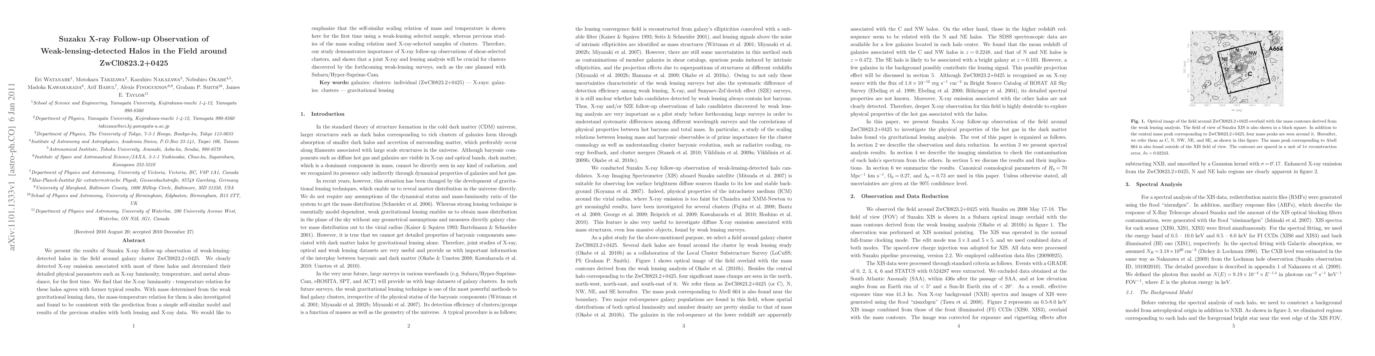We present the results of Suzaku X-ray follow-up observation of weak-lensing-detected halos in the field around galaxy cluster ZwCl0823.2+0425. We clearly detected X-ray emission associated with most of these halos and determined their detailed physical parameters such as X-ray luminosity, temperature, and metal abundance, for the first time. We find that the X-ray luminosity - temperature relation for these halos agrees with former typical results. With mass determined from the weak gravitational lensing data, the mass-temperature relation for them is also investigated and found to be consistent with the prediction from a simple self-similar model and results of the previous studies with both lensing and X-ray data. We would like to emphasize that the self-similar scaling relation of mass and temperature is shown here for the first time using a weak-lensing selected sample, whereas previous studies of the mass scaling relation used X-ray-selected samples of clusters. Therefore, our study demonstrates importance of X-ray follow-up observations of shear-selected clusters, and shows that a joint X-ray and lensing analysis will be crucial for clusters discovered by the forthcoming weak-lensing surveys, such as the one planned with Subaru/Hyper-Suprime-Cam.