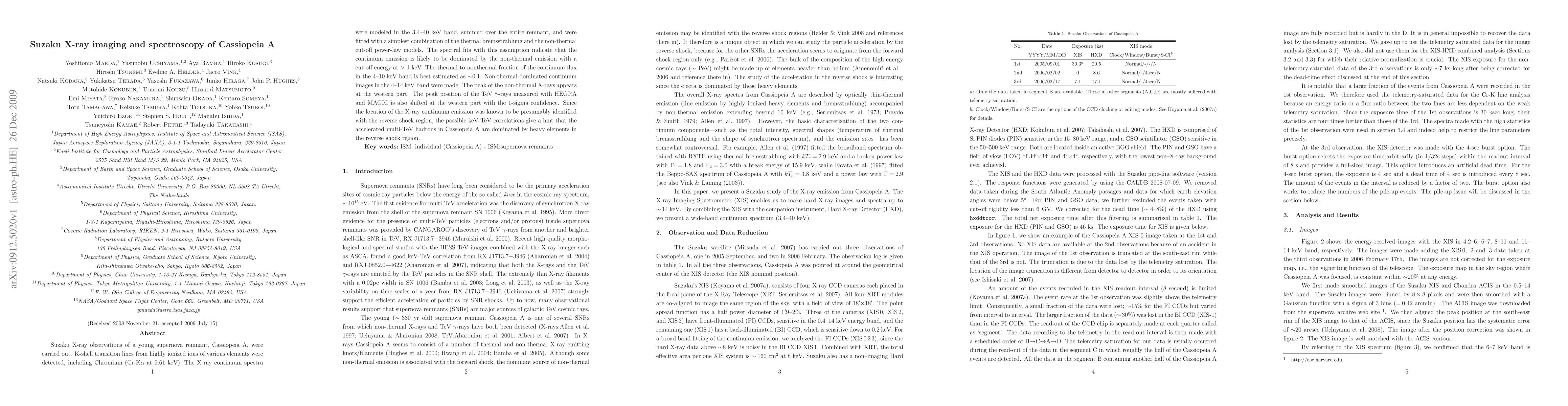 Suzaku X-ray observations of Cassiopeia A revealed K-shell transition lines from highly ionized ions, indicating non-thermal emission dominates the continuum spectrum. The non-thermal peak in X-rays correlates with the western region, suggesting heavy elements dominate accelerated multi-TeV hadrons in the reverse shock.