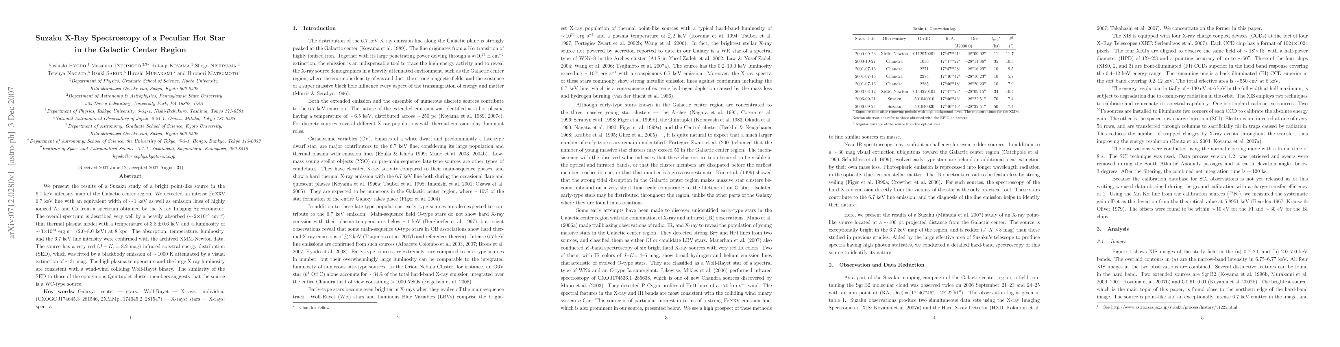 We present the results of a Suzaku study of a bright point-like source in the 6.7 keV intensity map of the Galactic center region. We detected an intense FeXXV 6.7 keV line with an equivalent width of ~1 keV as well as emission lines of highly ionized Ar and Ca from a spectrum obtained by the X-ray Imaging Spectrometer. The overall spectrum is described very well by a heavily absorbed (~2x10^{23}cm^{-2}) thin thermal plasma model with a temperature of 3.8+/-0.6 keV and a luminosity of ~3x10^{34} erg s^{-1} (2.0--8.0 keV) at 8 kpc. The absorption, temperature, luminosity, and the 6.7 keV line intensity were confirmed with the archived XMM-Newton data. The source has a very red (J-Ks=8.2 mag) infrared spectral energy distribution (SED), which was fitted by a blackbody emission of ~1000 K attenuated by a visual extinction of ~31 mag. The high plasma temperature and the large X-ray luminosity are consistent with a wind-wind colliding Wolf-Rayet binary. The similarity of the SED to those of the eponymous Quintuplet cluster members suggests that the source is a WC-type source.