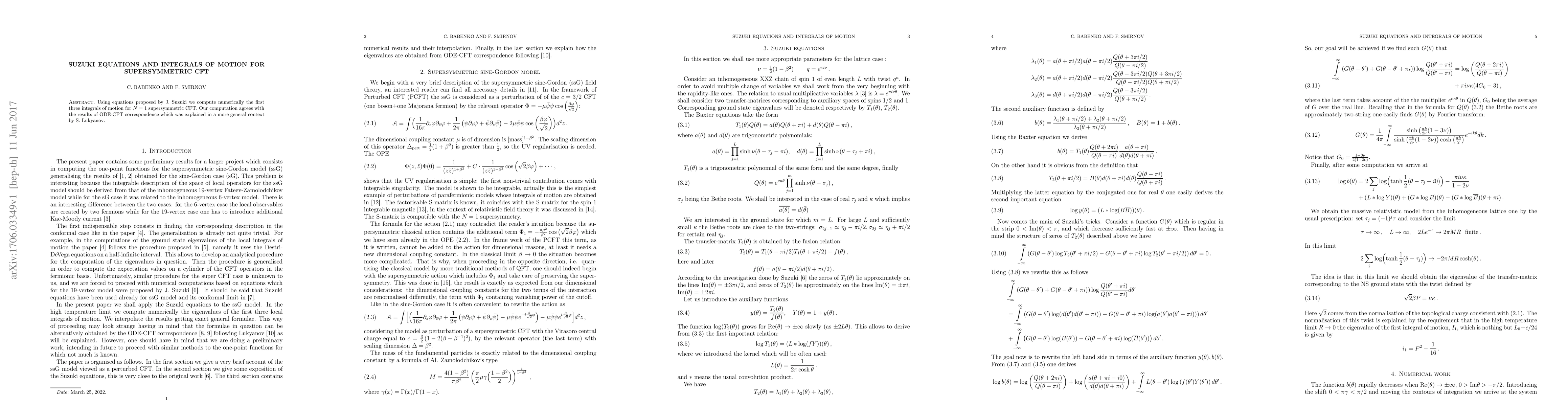 Using equations proposed by J. Suzuki we compute numerically the first three integrals of motion for $N=1$ supersymmetric CFT. Our computation agrees with the results of ODE-CFT correspondence which was explained in a more general context by S. Lukyanov.