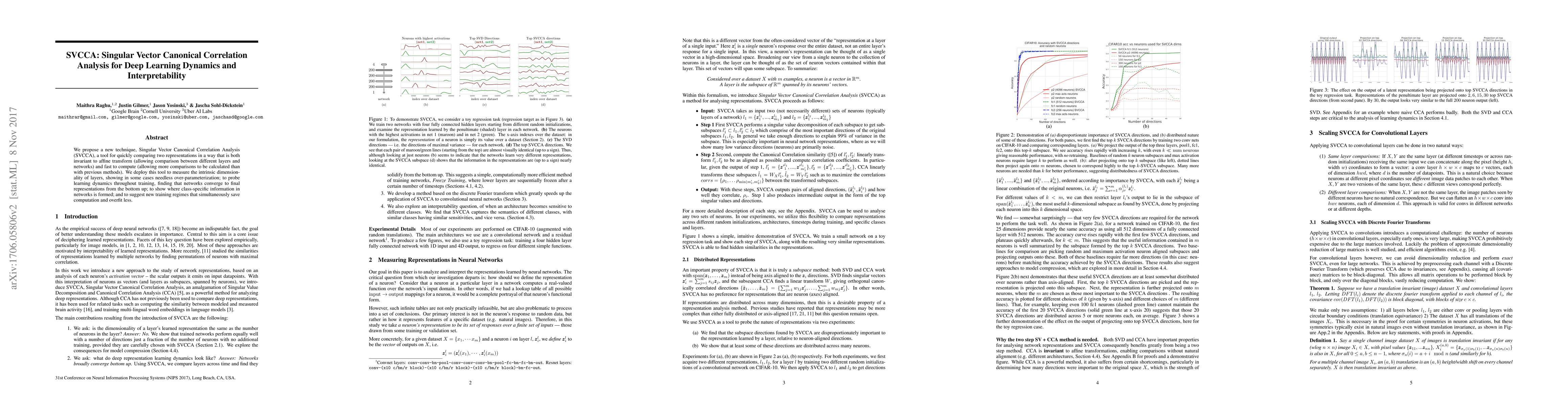 We propose a new technique, Singular Vector Canonical Correlation Analysis (SVCCA), a tool for quickly comparing two representations in a way that is both invariant to affine transform (allowing comparison between different layers and networks) and fast to compute (allowing more comparisons to be calculated than with previous methods). We deploy this tool to measure the intrinsic dimensionality of layers, showing in some cases needless over-parameterization; to probe learning dynamics throughout training, finding that networks converge to final representations from the bottom up; to show where class-specific information in networks is formed; and to suggest new training regimes that simultaneously save computation and overfit less. Code: https://github.com/google/svcca/
