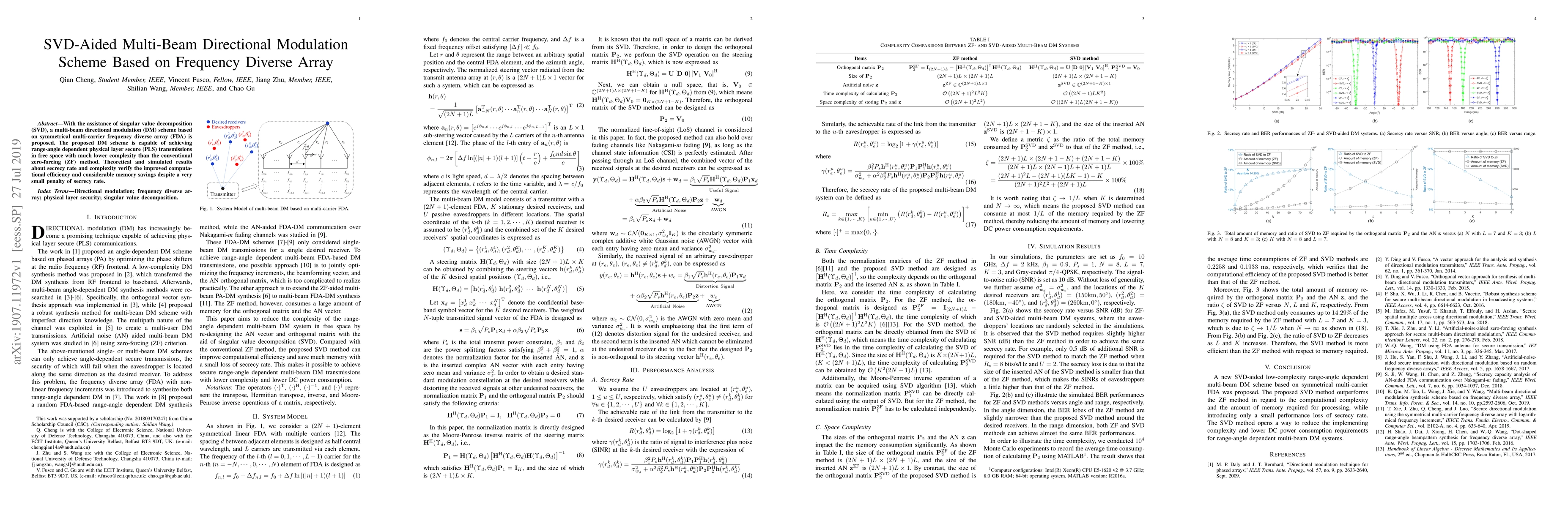 The paper proposes an SVD-aided multi-beam directional modulation scheme using a frequency diverse array, achieving secure transmissions with lower complexity compared to zero-forcing methods, while maintaining a slight reduction in secrecy rate. Theoretical and simulated results demonstrate improved computational efficiency and memory savings.