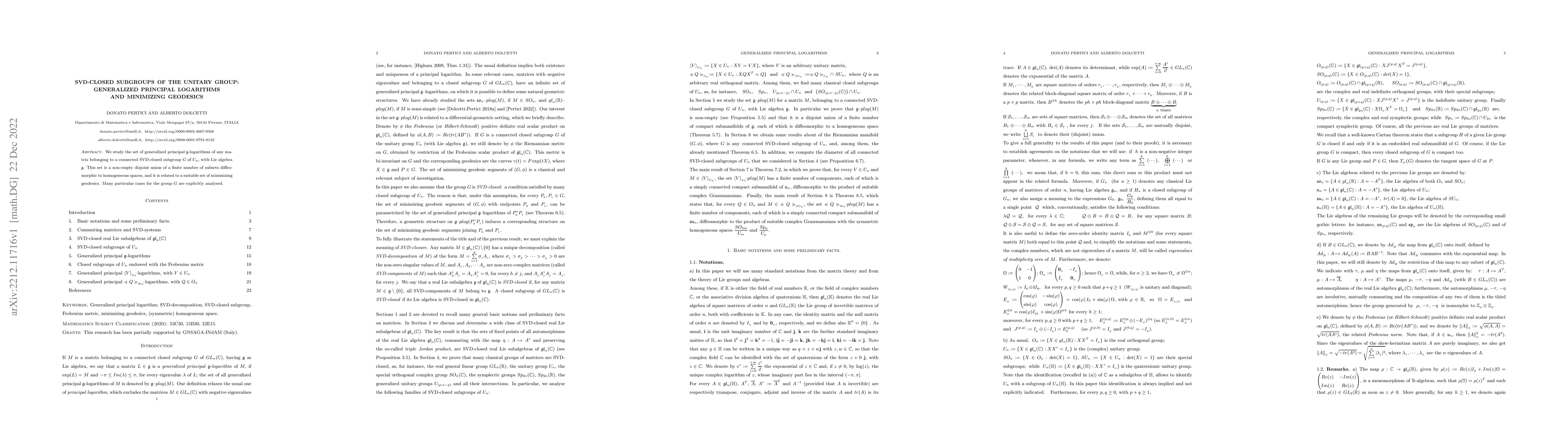 We study the set of generalized principal $\mathfrak{g}$-logarithms of any matrix belonging to a connected SVD-closed subgroup $G$ of $U_n$, with Lie algebra $\mathfrak{g}$. This set is a non-empty disjoint union of a finite number of subsets diffeomorphic to homogeneous spaces, and it is related to a suitable set of minimizing geodesics. Many particular cases for the group $G$ are explicitly analysed.