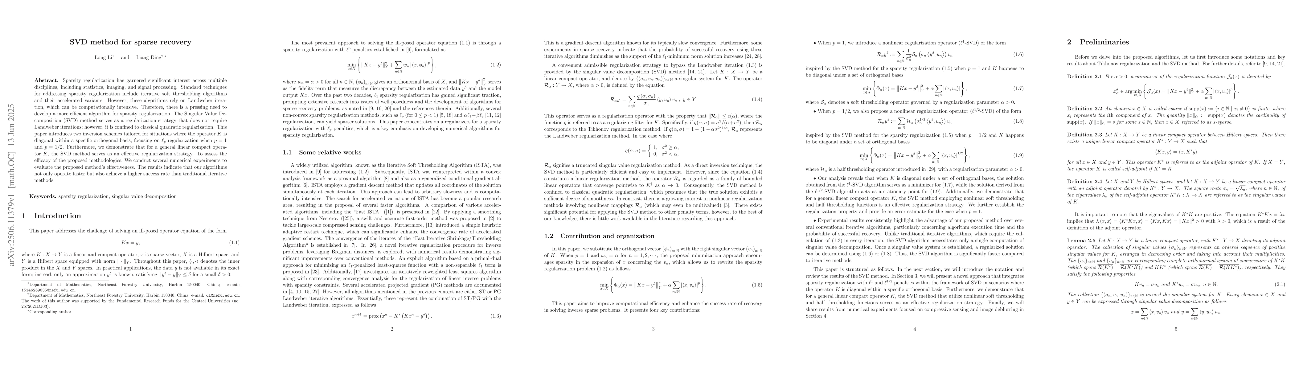 Sparsity regularization has garnered significant interest across multiple disciplines, including statistics, imaging, and signal processing. Standard techniques for addressing sparsity regularization include iterative soft thresholding algorithms and their accelerated variants. However, these algorithms rely on Landweber iteration, which can be computationally intensive. Therefore, there is a pressing need to develop a more efficient algorithm for sparsity regularization. The Singular Value Decomposition (SVD) method serves as a regularization strategy that does not require Landweber iterations; however, it is confined to classical quadratic regularization. This paper introduces two inversion schemes tailored for situations where the operator $K$ is diagonal within a specific orthogonal basis, focusing on $\ell_{p}$ regularization when $p=1$ and $p=1/2$. Furthermore, we demonstrate that for a general linear compact operator $K$, the SVD method serves as an effective regularization strategy. To assess the efficacy of the proposed methodologies, We conduct several numerical experiments to evaluate the proposed method's effectiveness. The results indicate that our algorithms not only operate faster but also achieve a higher success rate than traditional iterative methods.