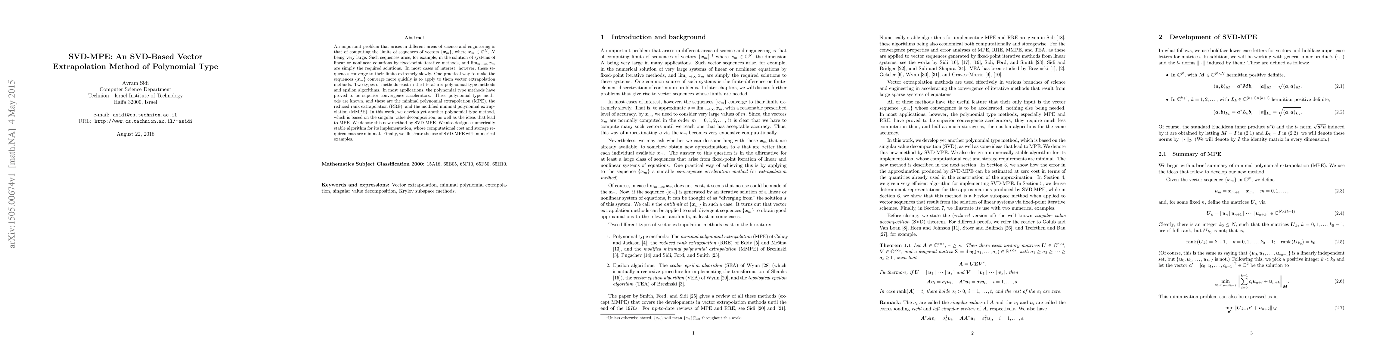 An important problem that arises in different areas of science and engineering is that of computing the limits of sequences of vectors $\{\xx_m\}$, where $\xx_m\in \C^N$, $N$ being very large. Such sequences arise, for example, in the solution of systems of linear or nonlinear equations by fixed-point iterative methods, and $\lim_{m\to\infty}\xx_m$ are simply the required solutions. In most cases of interest, however, these sequences converge to their limits extremely slowly. One practical way to make the sequences $\{\xx_m\}$ converge more quickly is to apply to them vector extrapolation methods. Two types of methods exist in the literature: polynomial type methods and epsilon algorithms. In most applications, the polynomial type methods have proved to be superior convergence accelerators. Three polynomial type methods are known, and these are the {minimal polynomial extrapolation} (MPE), the {reduced rank extrapolation} (RRE), and the {modified minimal polynomial extrapolation} (MMPE). In this work, we develop yet another polynomial type method, which is based on the singular value decomposition, as well as the ideas that lead to MPE. We denote this new method by SVD-MPE. We also design a numerically stable algorithm for its implementation, whose computational cost and storage requirements are minimal. Finally, we illustrate the use of {SVD-MPE} with numerical examples.