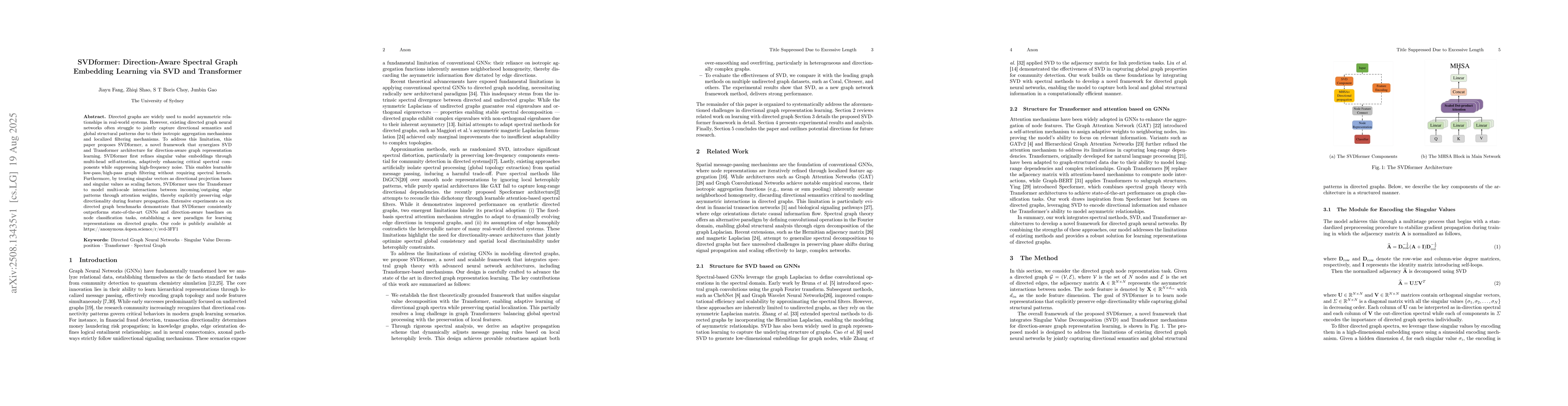 Directed graphs are widely used to model asymmetric relationships in real-world systems. However, existing directed graph neural networks often struggle to jointly capture directional semantics and global structural patterns due to their isotropic aggregation mechanisms and localized filtering mechanisms. To address this limitation, this paper proposes SVDformer, a novel framework that synergizes SVD and Transformer architecture for direction-aware graph representation learning. SVDformer first refines singular value embeddings through multi-head self-attention, adaptively enhancing critical spectral components while suppressing high-frequency noise. This enables learnable low-pass/high-pass graph filtering without requiring spectral kernels. Furthermore, by treating singular vectors as directional projection bases and singular values as scaling factors, SVDformer uses the Transformer to model multi-scale interactions between incoming/outgoing edge patterns through attention weights, thereby explicitly preserving edge directionality during feature propagation. Extensive experiments on six directed graph benchmarks demonstrate that SVDformer consistently outperforms state-of-the-art GNNs and direction-aware baselines on node classification tasks, establishing a new paradigm for learning representations on directed graphs.