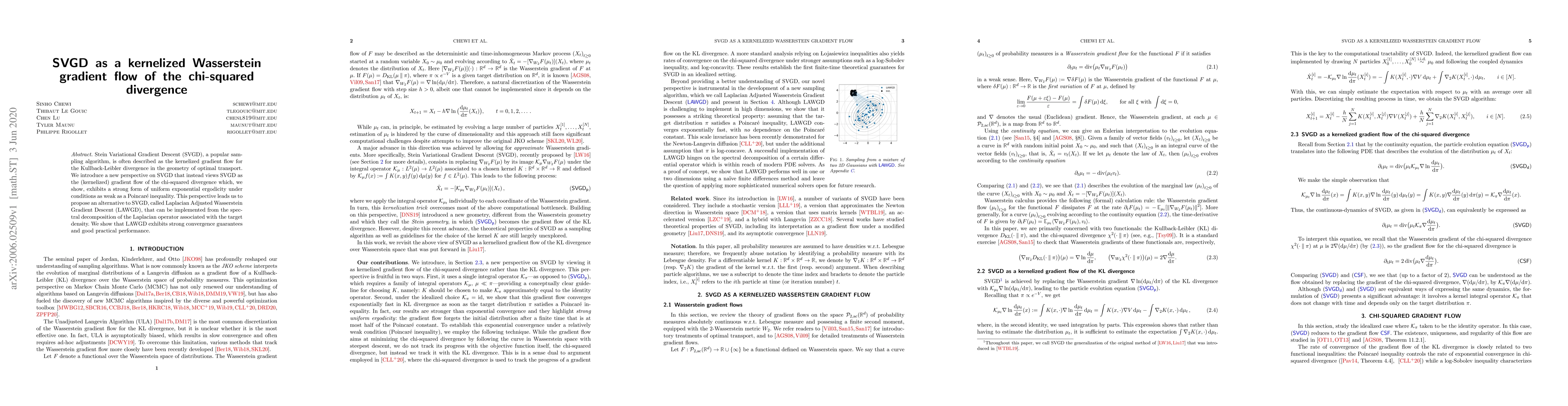 Stein Variational Gradient Descent (SVGD), a popular sampling algorithm, is often described as the kernelized gradient flow for the Kullback-Leibler divergence in the geometry of optimal transport. We introduce a new perspective on SVGD that instead views SVGD as the (kernelized) gradient flow of the chi-squared divergence which, we show, exhibits a strong form of uniform exponential ergodicity under conditions as weak as a Poincar\'e inequality. This perspective leads us to propose an alternative to SVGD, called Laplacian Adjusted Wasserstein Gradient Descent (LAWGD), that can be implemented from the spectral decomposition of the Laplacian operator associated with the target density. We show that LAWGD exhibits strong convergence guarantees and good practical performance.
