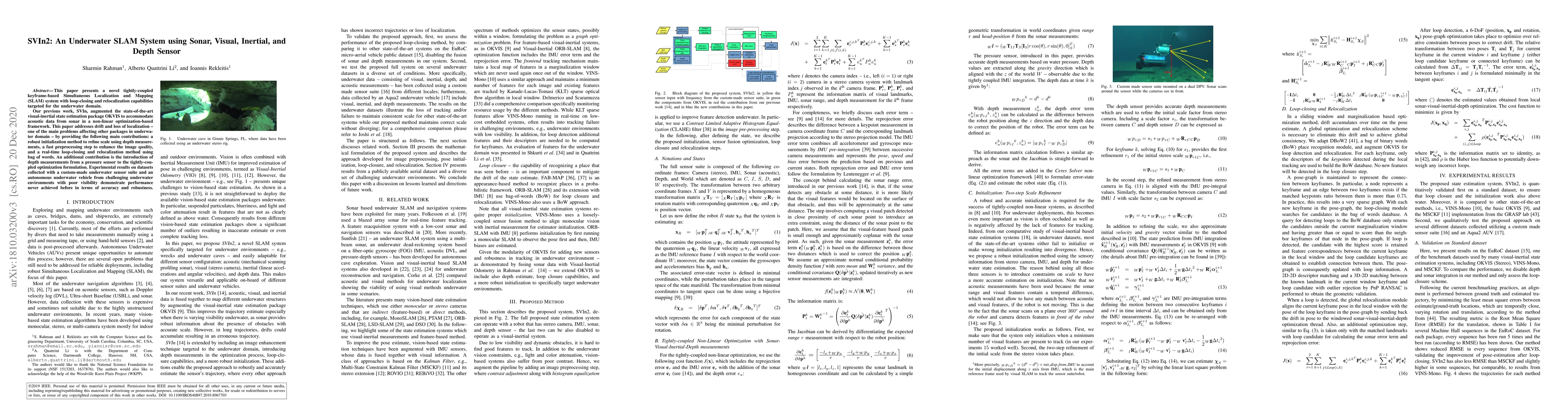 This paper introduces SVIn2, a tightly-coupled underwater SLAM system integrating sonar, visual, inertial, and depth sensors to address drift and localization issues. Key contributions include improved initialization, image preprocessing, and real-time loop-closing and relocalization, validated by superior performance in challenging underwater environments.