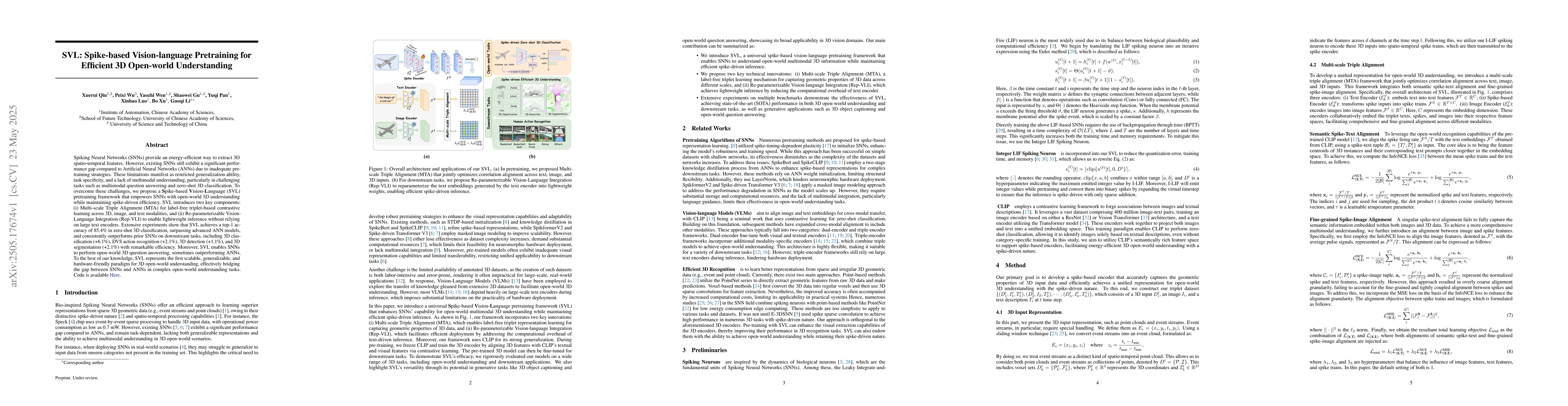This research paper introduces SVL, a Spike-based Vision-Language pretraining framework that enables efficient 3D open-world understanding in SNNs, surpassing ANNs on tasks like zero-shot 3D classification and outperforming prior SNNs.