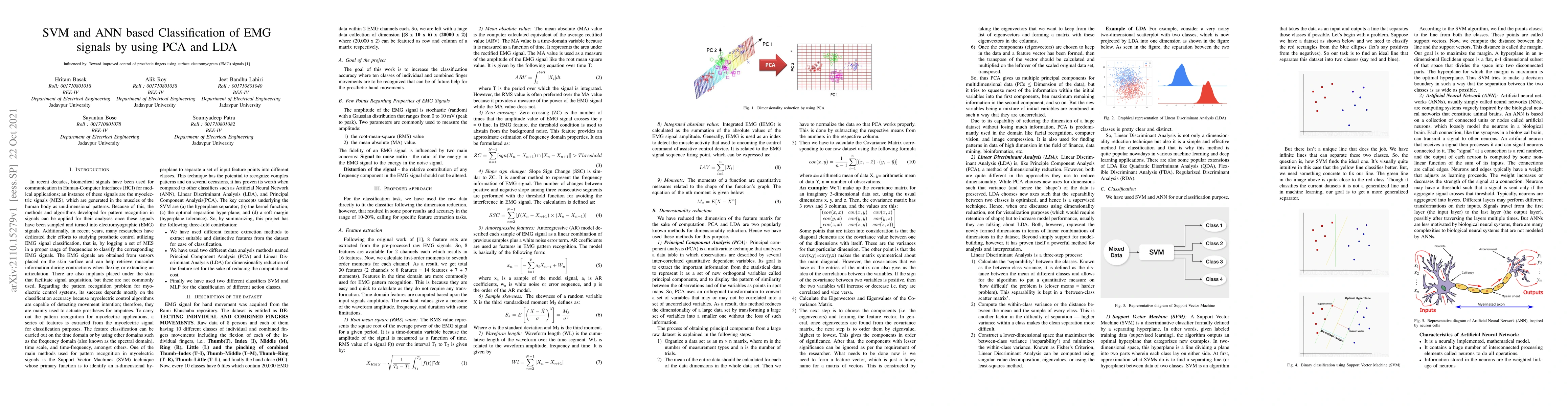 This paper explores the classification of electromyographic (EMG) signals using Support Vector Machines (SVM) and Artificial Neural Networks (ANN) with feature reduction techniques like PCA and LDA. The study aims to enhance prosthetic control through effective EMG signal classification, leveraging SVM's ability to identify complex patterns and compare it with ANN and LDA.