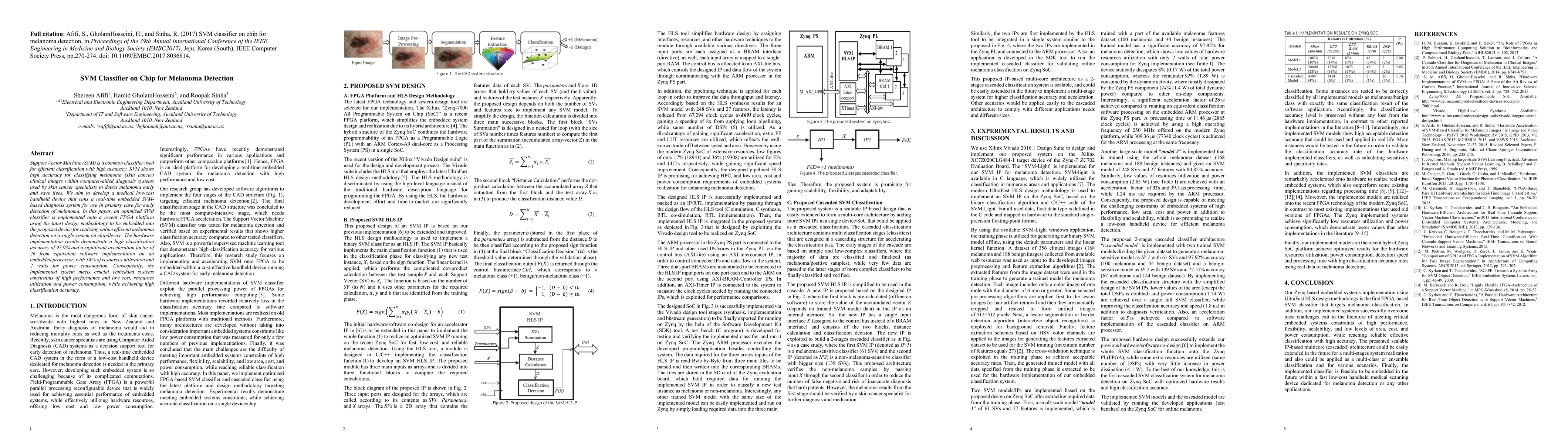 This paper presents an optimized SVM classifier implemented on an FPGA for a low-cost handheld device aimed at early melanoma detection. The embedded system achieves 97.9% classification accuracy, demonstrating significant performance improvements and resource efficiency.