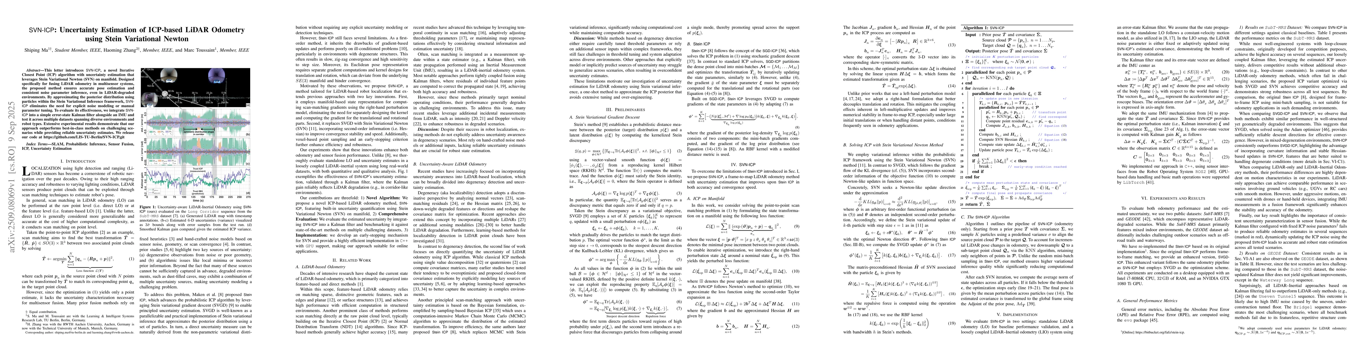 This letter introduces SVN-ICP, a novel Iterative Closest Point (ICP) algorithm with uncertainty estimation that leverages Stein Variational Newton (SVN) on manifold. Designed specifically for fusing LiDAR odometry in multisensor systems, the proposed method ensures accurate pose estimation and consistent noise parameter inference, even in LiDAR-degraded environments. By approximating the posterior distribution using particles within the Stein Variational Inference framework, SVN-ICP eliminates the need for explicit noise modeling or manual parameter tuning. To evaluate its effectiveness, we integrate SVN-ICP into a simple error-state Kalman filter alongside an IMU and test it across multiple datasets spanning diverse environments and robot types. Extensive experimental results demonstrate that our approach outperforms best-in-class methods on challenging scenarios while providing reliable uncertainty estimates.