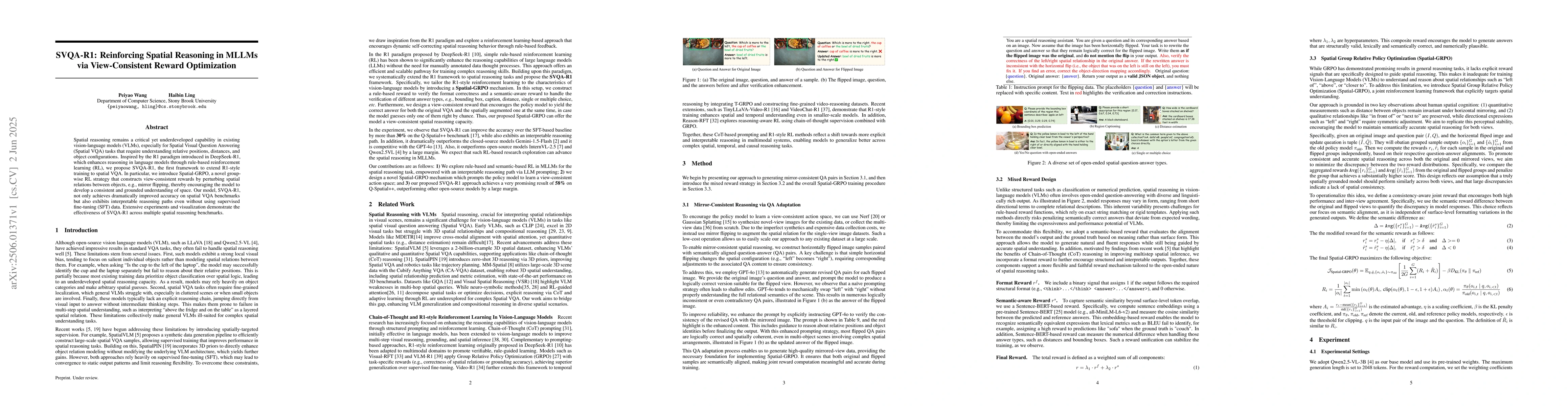 The research proposes SVQA-R1, a framework extending R1-style training to spatial VQA tasks by introducing Spatial-GRPO, a group-wise RL strategy that constructs view-consistent rewards via spatial relation perturbations like mirror flipping.