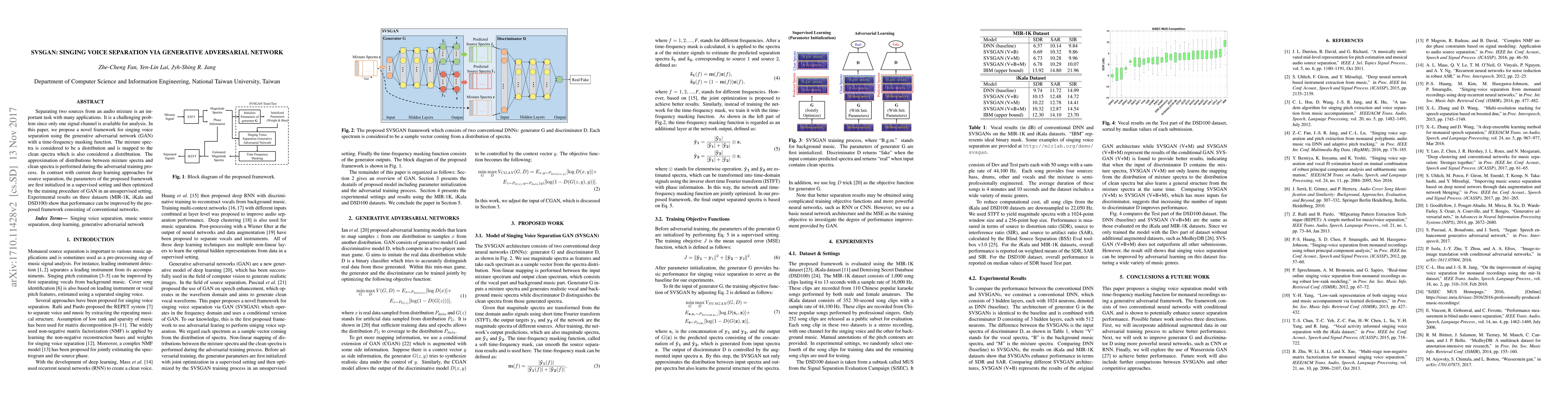 SVSGAN employs a generative adversarial network (GAN) with a time-frequency masking function for singing voice separation, initializing parameters in a supervised manner before optimizing in an unsupervised GAN training process. Experimental results demonstrate improved performance over conventional networks on three datasets.