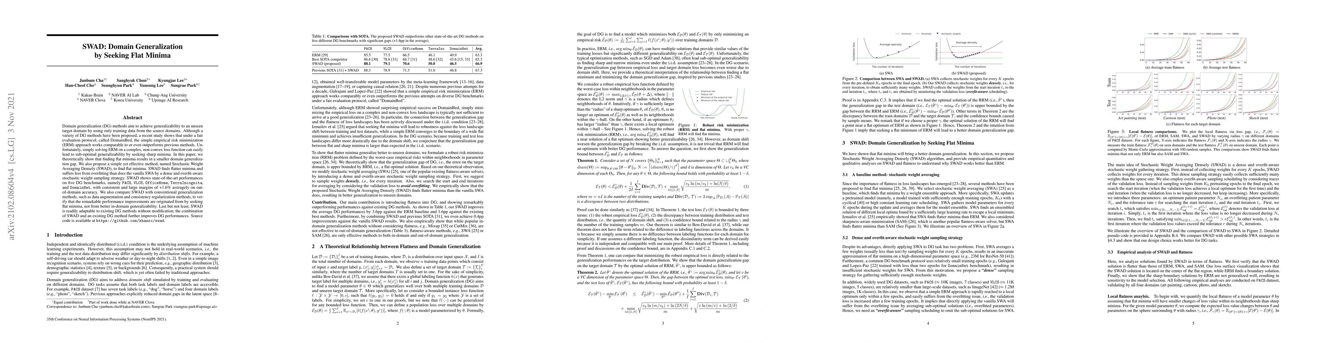 This paper proposes SWAD, a method for domain generalization that seeks flat minima to achieve better generalizability. Through theoretical analysis and empirical results on five benchmarks, SWAD demonstrates superior performance compared to conventional methods, attributing its success to the strategy of finding flatter minima rather than enhanced in-domain generalization.