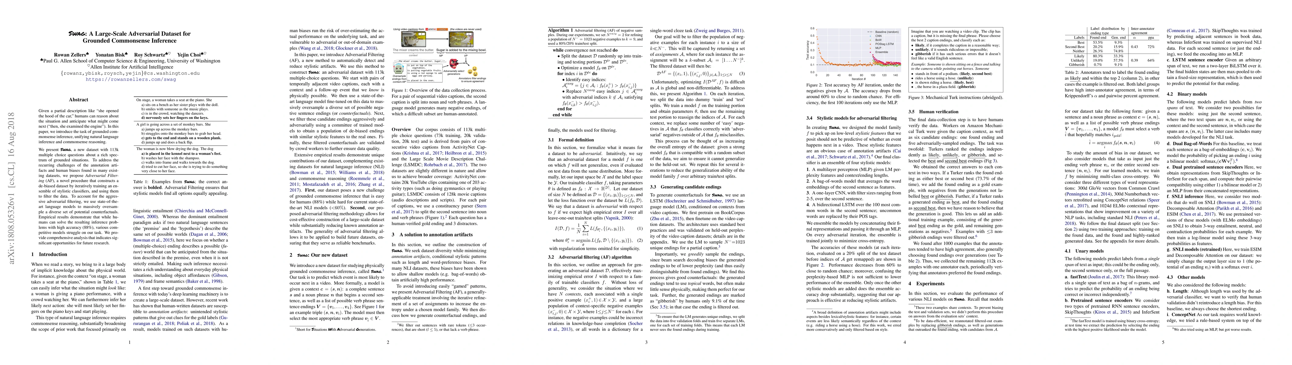 This paper introduces SWAG, a large-scale adversarial dataset for grounded commonsense inference, featuring 113k multiple choice questions to test reasoning about real-world scenarios. The authors propose Adversarial Filtering to mitigate annotation biases, resulting in a dataset that challenges even the most advanced models while achieving high human accuracy.