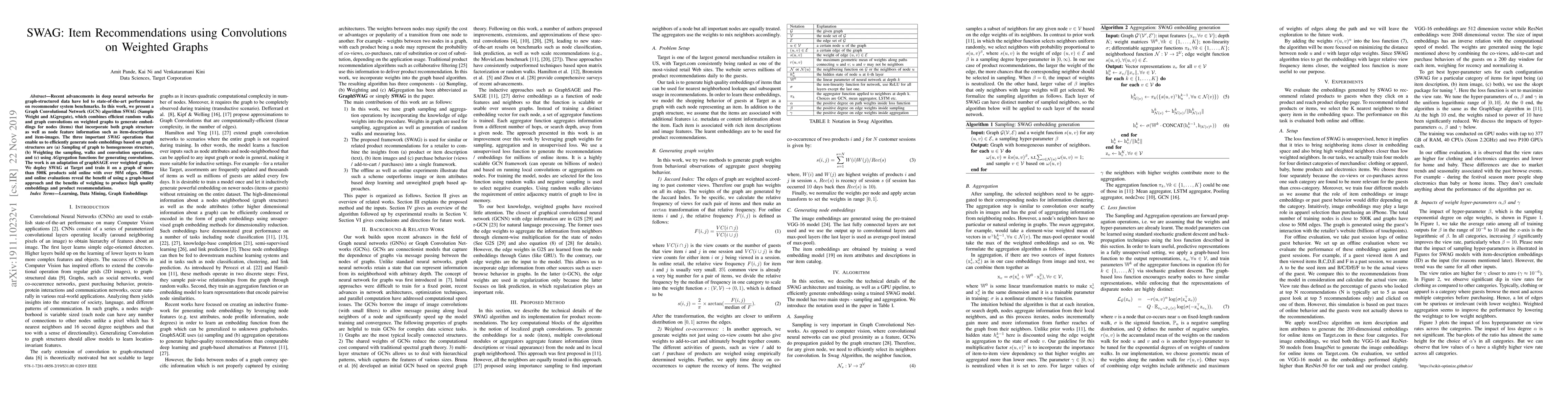 Recent advancements in deep neural networks for graph-structured data have led to state-of-the-art performance on recommender system benchmarks. In this work, we present a Graph Convolutional Network (GCN) algorithm SWAG (Sample Weight and AGgregate), which combines efficient random walks and graph convolutions on weighted graphs to generate embeddings for nodes (items) that incorporate both graph structure as well as node feature information such as item-descriptions and item-images. The three important SWAG operations that enable us to efficiently generate node embeddings based on graph structures are (a) Sampling of graph to homogeneous structure, (b) Weighting the sampling, walks and convolution operations, and (c) using AGgregation functions for generating convolutions. The work is an adaptation of graphSAGE over weighted graphs. We deploy SWAG at Target and train it on a graph of more than 500K products sold online with over 50M edges. Offline and online evaluations reveal the benefit of using a graph-based approach and the benefits of weighing to produce high quality embeddings and product recommendations.