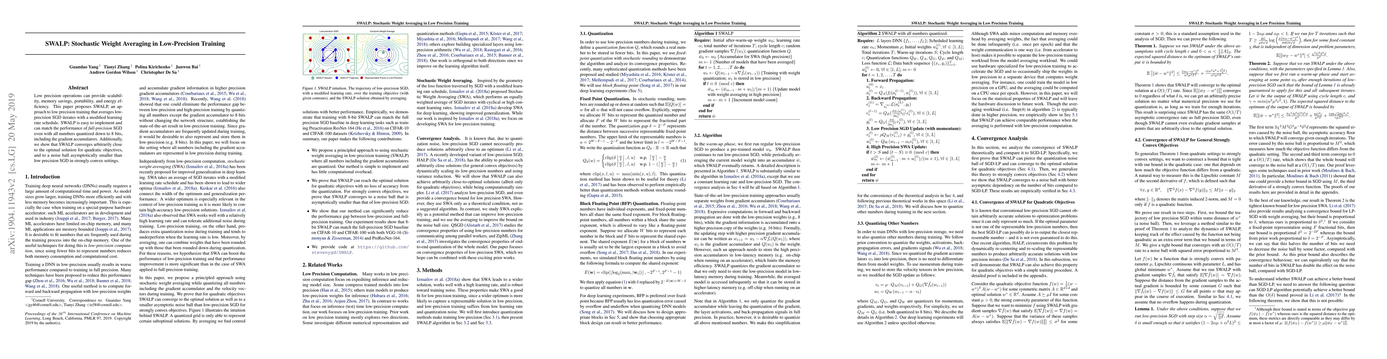 SWALP is a low-precision training method that averages stochastic gradient descent (SGD) iterates with a modified learning rate schedule, achieving performance comparable to full-precision SGD while using 8-bit quantization. It converges closely to the optimal solution for quadratic objectives and performs better than low precision SGD in strongly convex settings.