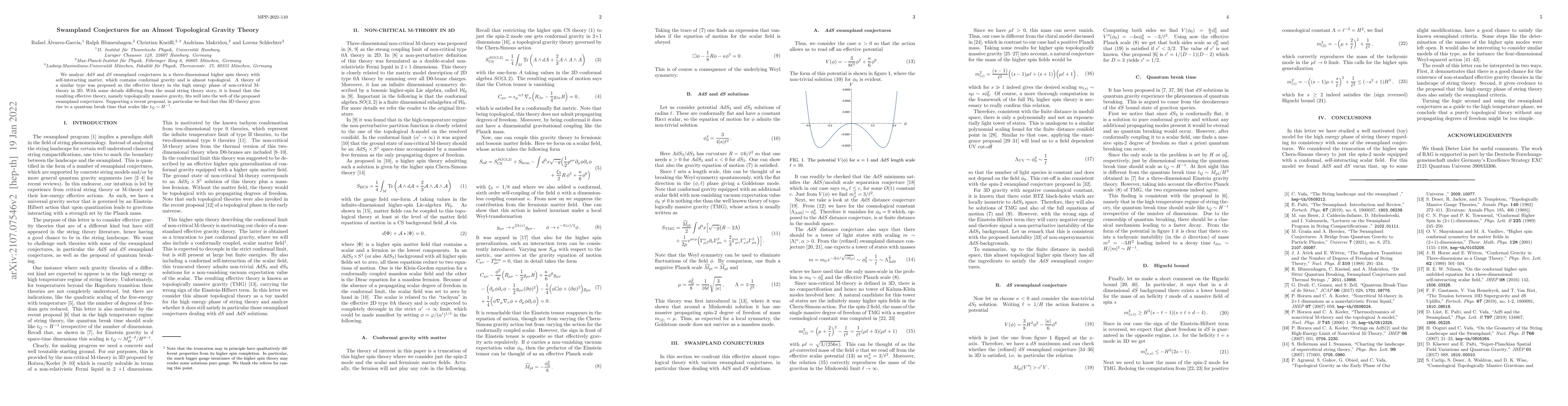 We analyze AdS and dS swampland conjectures in a three-dimensional higher spin theory with self-interacting matter, which contains conformal gravity and is almost topological. A theory of a similar type was proposed as the effective theory in the high energy phase of non-critical M-theory in 3D. With some details differing from the usual string theory story, it is found that the resulting effective theory, namely topologically massive gravity, fits well into the web of the proposed swampland conjectures. Supporting a recent proposal, in particular we find that this 3D theory gives rise to a quantum break time that scales like $t_Q\sim H^{-1}$.