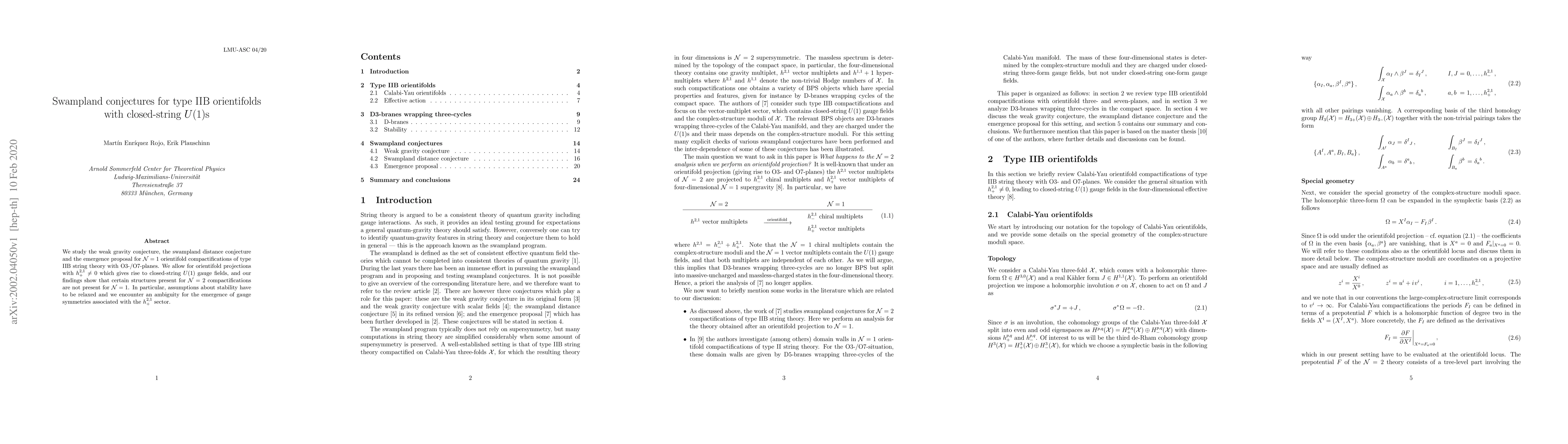 We study the weak gravity conjecture, the swampland distance conjecture and the emergence proposal for $\mathcal{N}=1$ orientifold compactifications of type IIB string theory with O3-/O7-planes. We allow for orientifold projections with $h^{2,1}_+\neq 0$ which gives rise to closed-string $U(1)$ gauge fields, and our findings show that certain structures present for $\mathcal N=2$ compactifications are not present for $\mathcal N=1$. In particular, assumptions about stability have to be relaxed and we encounter an ambiguity for the emergence of gauge symmetries associated with the $h^{2,1}_+$ sector.