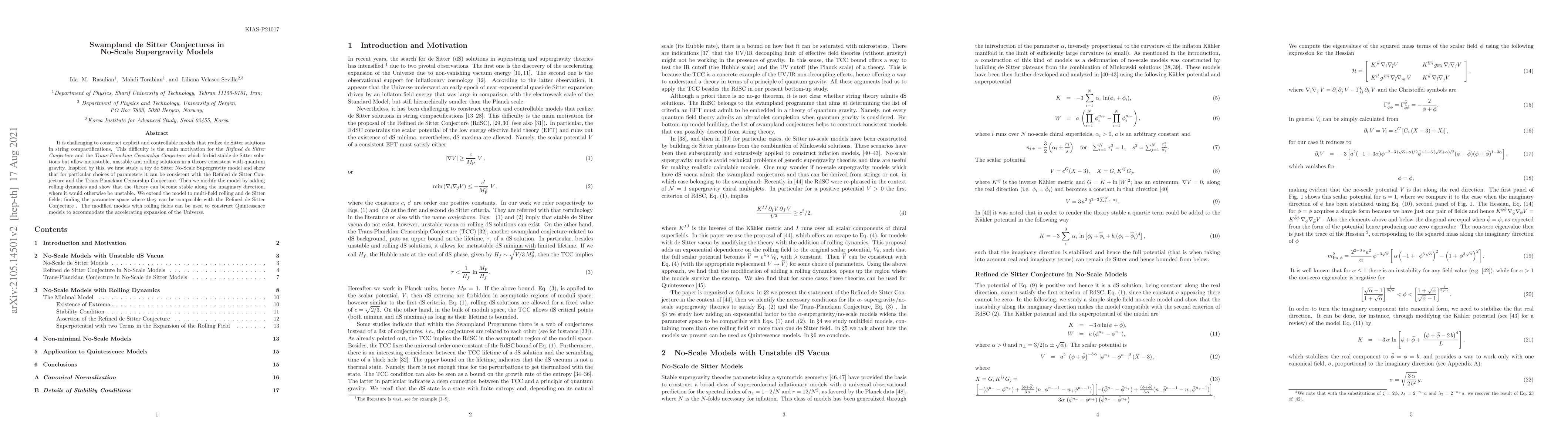 It is challenging to construct explicit and controllable models that realize de Sitter solutions in string compactifications. This difficulty is the main motivation for the Refined de Sitter Conjecture and the Trans-Planckian Censorship Conjecture which forbid stable de Sitter solutions but allow metastable, unstable and rolling solutions in a theory consistent with quantum gravity. Inspired by this, we first study a toy de Sitter No-Scale Supergravity model and show that for particular choices of parameters it can be consistent with the Refined de Sitter Conjecture and the Trans-Planckian Censorship Conjecture. Then we modify the model by adding rolling dynamics and show that the theory can become stable along the imaginary direction, where it would otherwise be unstable. We extend the model to multi-field rolling and de Sitter fields, finding the parameter space where they can be compatible with the Refined de Sitter Conjecture . The modified models with rolling fields can be used to construct Quintessence models to accommodate the accelerating expansion of the Universe.